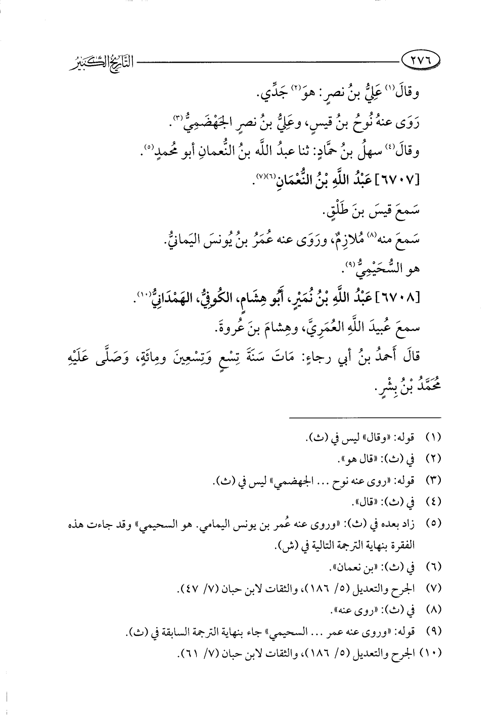 (¬٩) قوله: "وروى عنه عمر. . . السحيمي" جاء بنهاية الترجمة السابقة في (ث).