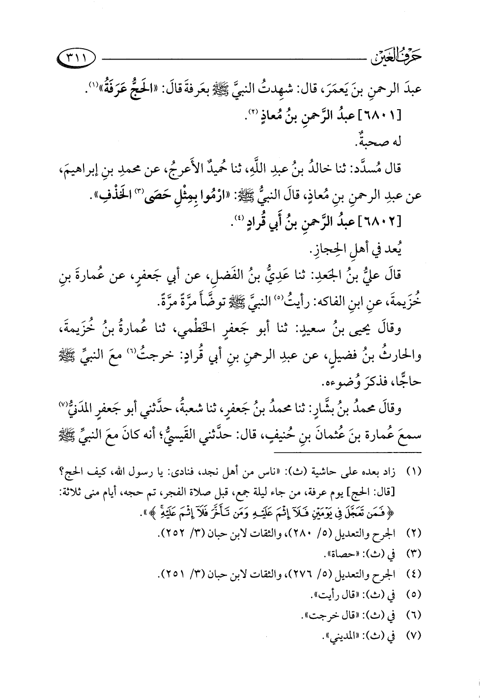 عبدَ الرحمنِ بنَ يَعمَرَ، قال: شهِدتُ النبيَّ -صلى اللَّه عليه وسلم- بعَرفةَ قالَ: "الحَجُّ عَرَفَةُ" (¬١).