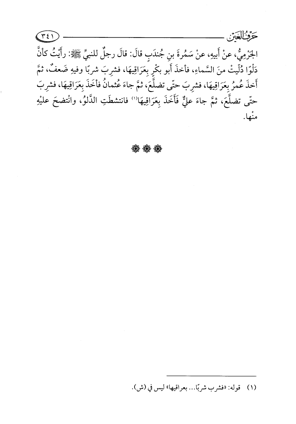 الجَرْمِيُّ، عنْ أَبيهِ، عنْ سَمُرةَ بنِ جُندَبٍ قالَ: قالَ رجلٌ للنبيِّ -صلى اللَّه عليه وسلم-: رأَيْتُ كأنَّ دَلْوًا دُلّيتْ منَ السَّماءِ، فأخذَ أَبُو بكْرٍ بِعَرَاقِيهَا، فشرِبَ شربًا وفيهِ ضَعفٌ، ثمَّ أخذَ عُمرُ بعَرَاقِيهَا، فشرِبَ حتّى تضلَّعَ، ثمَّ جاءَ عُثمانُ فأخَذَ بِعَرَاقِيهَا، فشرِبَ حتّى تضلَّعَ، ثمَّ جاءَ عليٌّ فَأَخَذَ بِعَرَاقِيهَا (¬١) فانتشطَتِ الدَّلوُ، وانْتضحَ عليْهِ منْها.