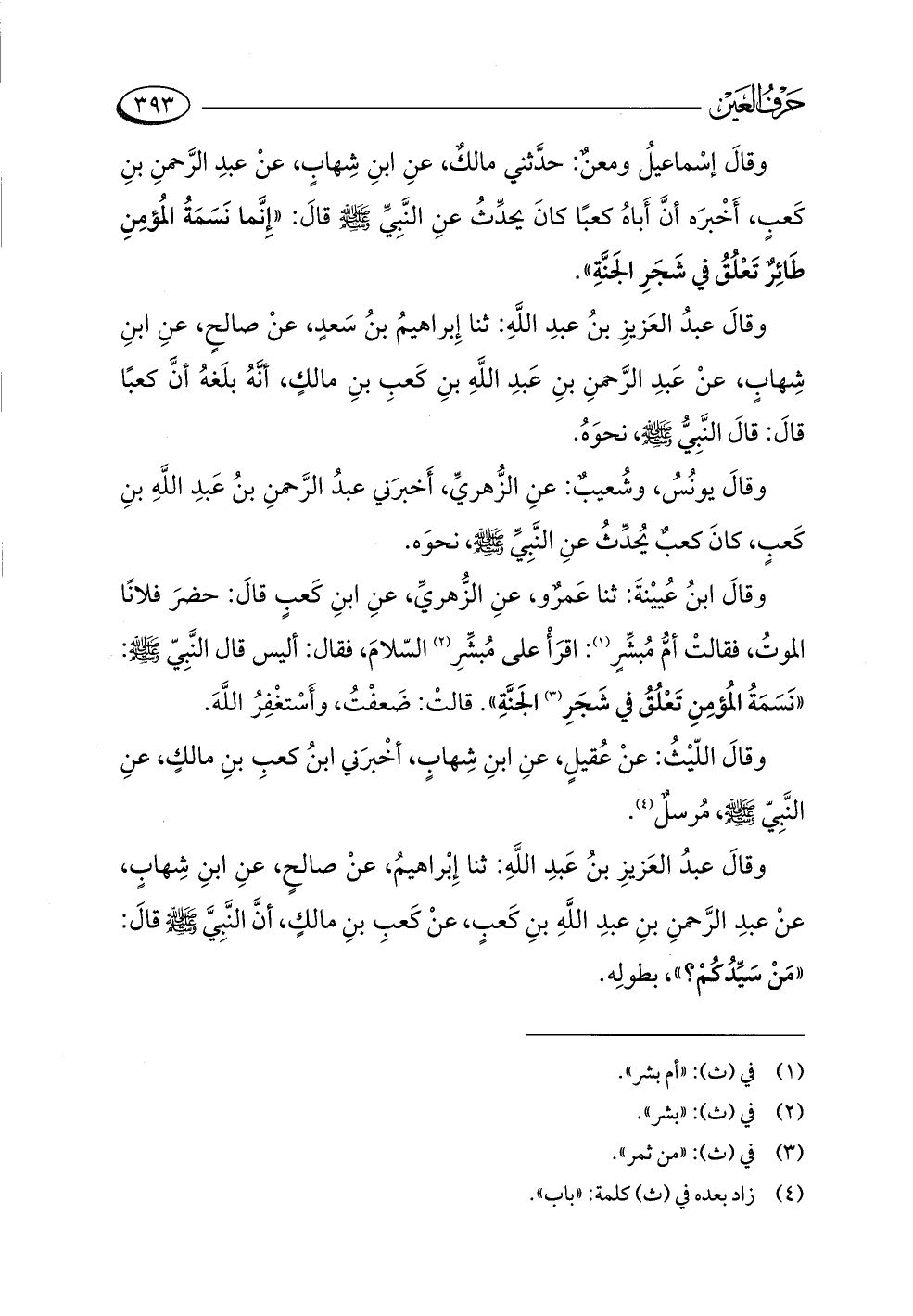 وقالَ ابنُ عُييْنةَ: ثنا عَمرٌو، عنِ الزُّهريِّ، عنِ ابنِ كَعبٍ قالَ: حضرَ فلانًا الموتُ، فقالتْ أمُّ مُبشِّرٍ (¬١): اقرَأْ على مُبشِّرِ (¬٢) السّلامَ، فقال: أليس قال النَّبِيّ -صلى اللَّه عليه وسلم-: "نَسَمَةُ المُؤمِنِ تَعْلُقُ في شَجَرِ (¬٣) الجَنَّةِ". قالتْ: ضَعفْتُ، وأَسْتغْفِرُ اللَّهَ.