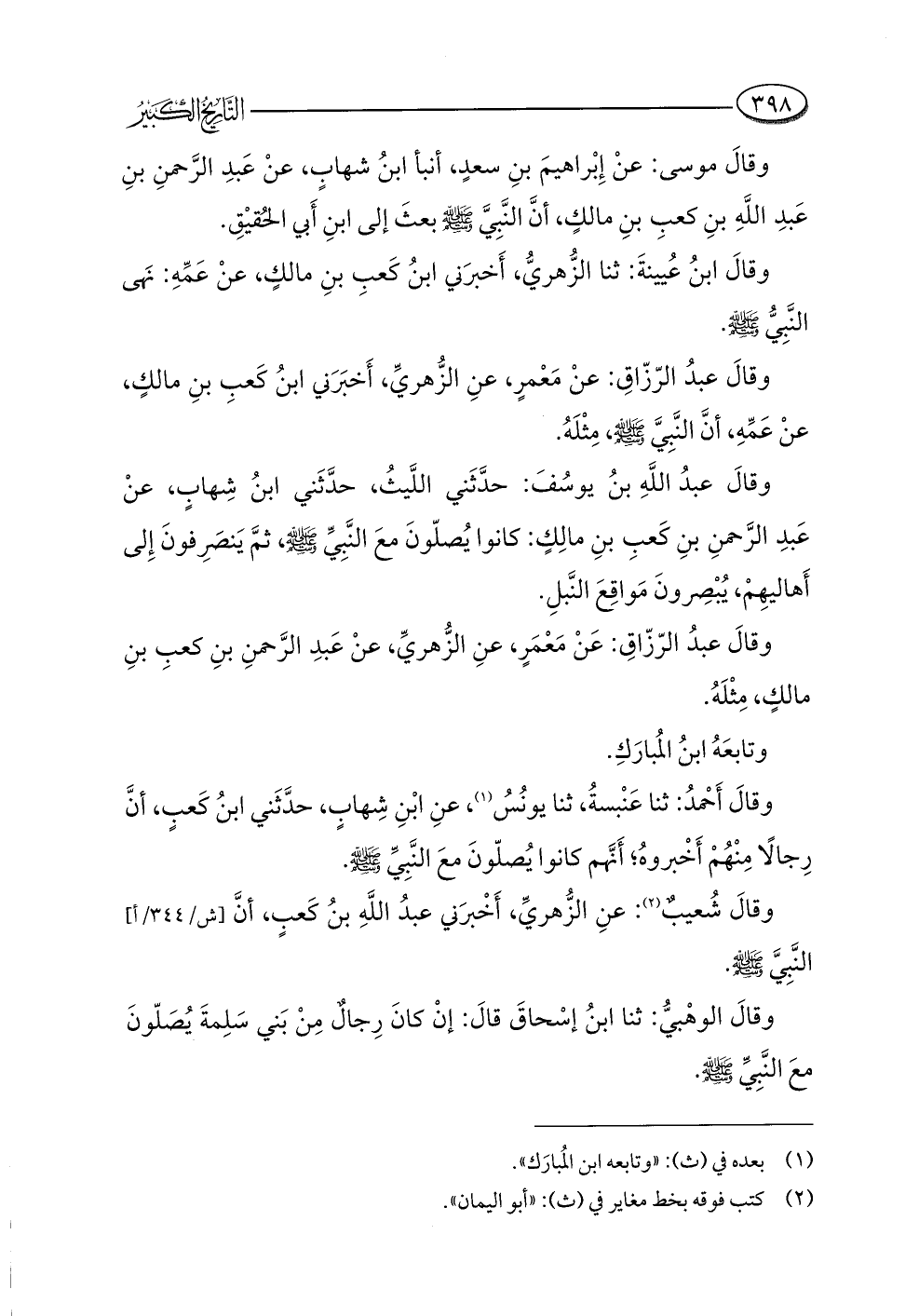 وقالَ موسى: عنْ إِبْراهيمَ بنِ سعدٍ، أنبأ ابنُ شهابٍ، عنْ عَبدِ الرَّحمنِ بنِ عَبدِ اللَّهِ بنِ كعبِ بنِ مالكٍ، أنَّ النَّبِيَّ -صلى اللَّه عليه وسلم- بعثَ إلى ابنِ أَبي الحُقيْقِ.