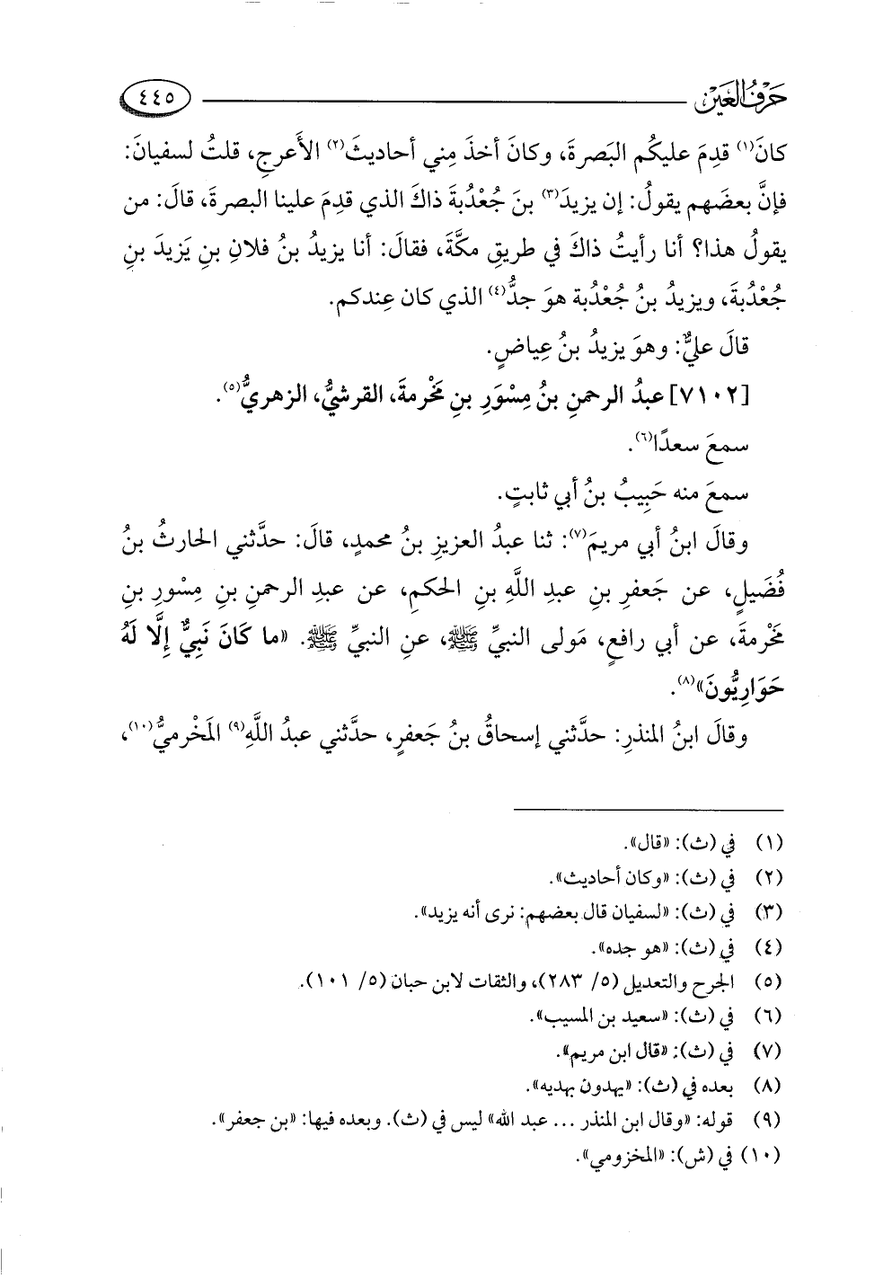 كانَ (¬١) قدِمَ عليكُم البَصرةَ، وكانَ أخذَ مِني أحاديثَ (¬٢) الأَعرجِ، قلتُ لسفيانَ: فإنَّ بعضَهم يقولُ: إن يزيدَ (¬٣) بنَ جُعْدُبةَ ذاكَ الذي قدِمَ علينا البصرةَ، قالَ: من يقولُ هذا؟ أنا رأيتُ ذاكَ في طريقِ مكَّةَ، فقالَ: أنا يزيدُ بنُ فلانِ بنِ يَزيدَ بنِ جُعْدُبةَ، ويزيدُ بنُ جُعْدُبة هوَ جدُّ (¬٤) الذي كان عِندكم.