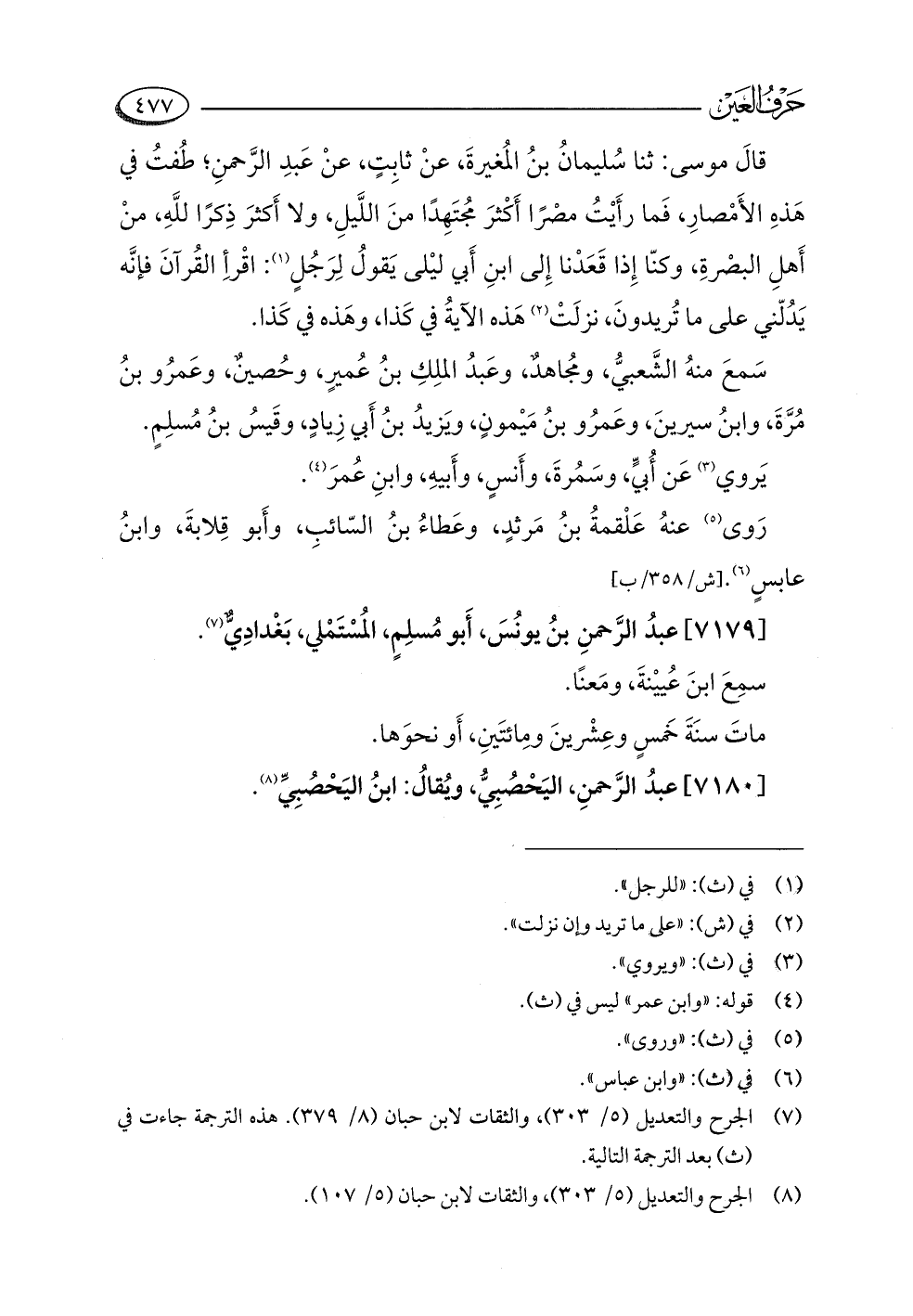 (¬٧) الجرح والتعديل (٥/ ٣٠٣)، والثقات لابن حبان (٨/ ٣٧٩). هذه الترجمة جاءت في (ث) بعد الترجمة التالية.