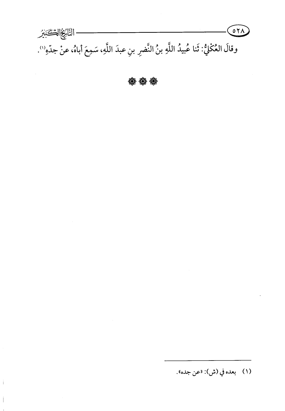 وقالَ العُكْليُّ: ثَنا عُبيدُ اللَّهِ بنُ النَّضرِ بنِ عبدَ اللَّهِ، سَمِعَ أباهُ، عنْ جدّهِ (¬١).