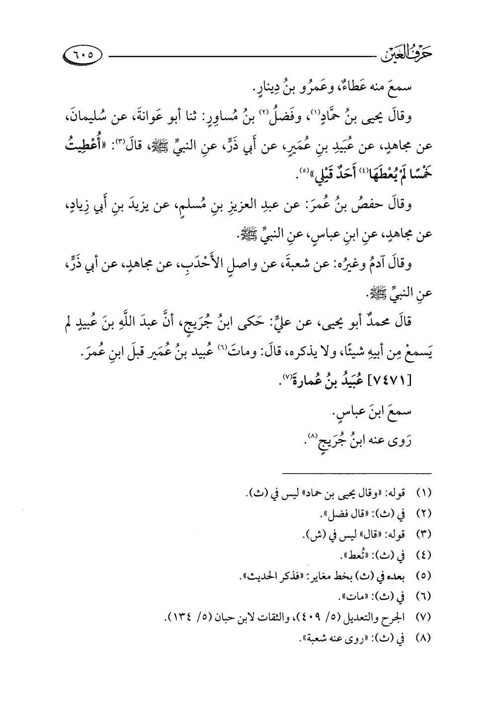 وقالَ يحيى بنُ حمَّادٍ (¬١)، وفَضلُ (¬٢) بنُ مُساوِرٍ: ثنا أبو عَوانةَ، عن سُليمانَ، عن مجاهدٍ، عن عُبَيدِ بنِ عُمَيرٍ، عن أَبي ذَرٍّ، عنِ النبيِّ -صلى اللَّه عليه وسلم-، قالَ (¬٣): "أُعْطِيتُ خَمْسًا لَمْ يُعْطَهَا (¬٤) أَحَدٌ قَبلي" (¬٥).