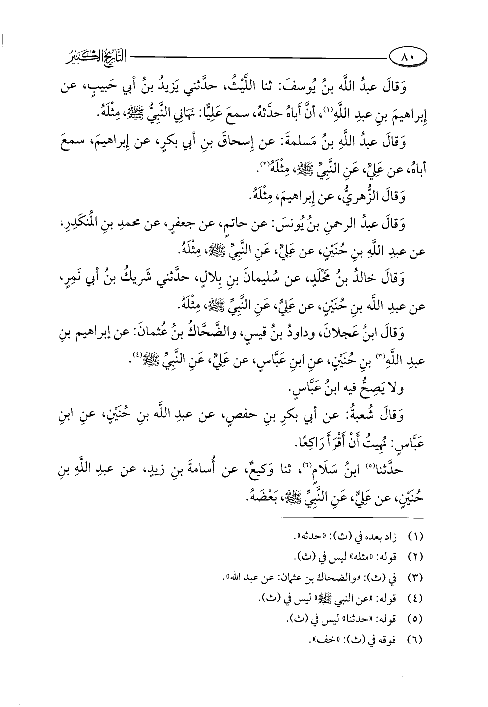 حدَّثنا (¬٥) ابنُ سَلَامٍ (¬٦)، ثنا وَكيعٌ، عن أُسامةَ بنِ زَيْدٍ، عن عبدِ اللَّهِ بنِ حُنَيْنٍ، عن عَلِيٍّ، عَنِ النَّبِيِّ -صلى اللَّه عليه وسلم-، بَعْضهُ.