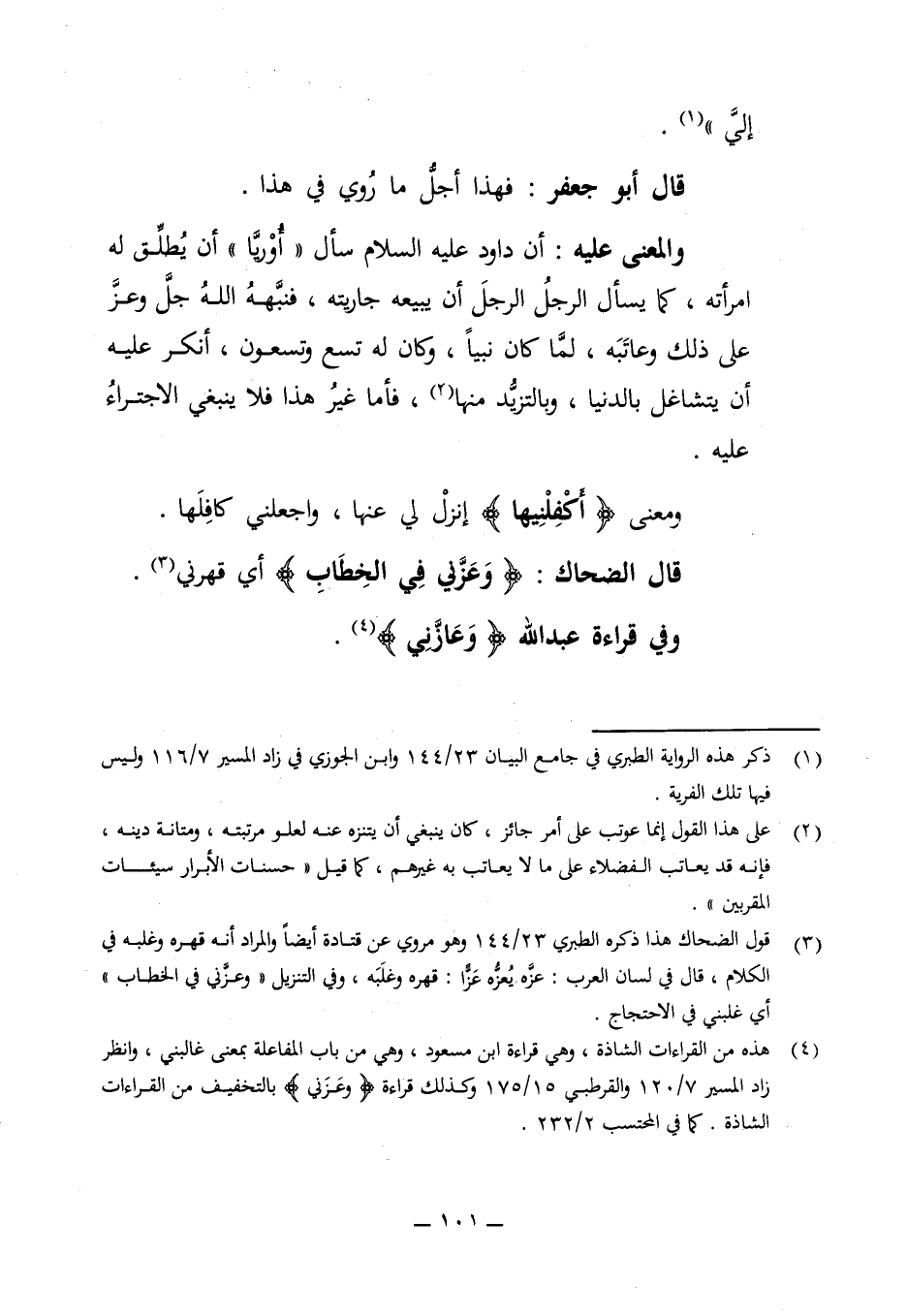 والمعنى عليه أن داود عليه السلام سأل أو ريا أن يطلق له امرأته كما يسال الرجل الرجل ان يبيعه جاريته فنبهه الله جل وعز على ذلك وعاتبه لما كان نبيا وكان له تسع وتسعون أنكر عليه أن يتشاغل بالدنيا وبالتزيد قبل منها فأما غير هذا فلا ينبغي الاجتراء عليه ومعنى أكفلنيها إنزل لي عنها واجعلني كافلها قال الضحاك (وعزني في الخطاب) أي قهرني وفي قراءة عبد الله وعازني