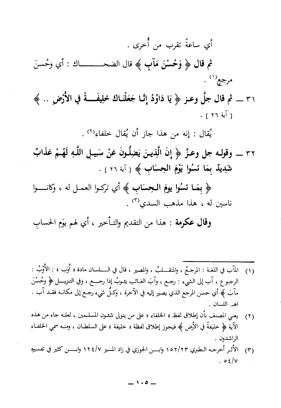 مرجع 31 - ثم قال جل وعز (يا داود إنا جعلناك خليفة في الأرض) (آية 26) يقال إنه من هذا جاز ان يقال خلفاء 32 - وقوله جل وعز (إن الذين يضلون عن سبيل الله لهم عذاب شديد بما نسوا يوم الحساب) (آية 26) (بما نسوا يوم الحساب) أي تركوا العمل له وكانوا ناسين له هذا مذهب السدي وقال عكرمة هذا من التقديم والتأخير أي لهم يوم الحساب