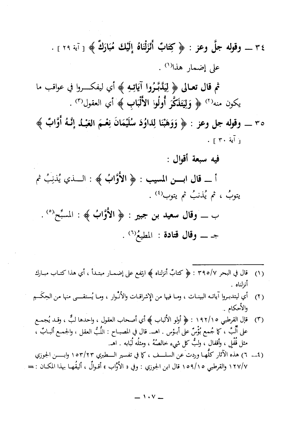ثم قال تعالى (ليدبروا آياته) أي ليفكروا في عواقب ما يكون منه (وليتذكر أولوا الألباب) أي العقول 35 - وقوله جل وعز (ووهبنا لداود سليمان نعم العبد إنه أواب) (آية 30) فيه سبعة أقوال: أ - قال ابن المسيب الأواب الذي يذنب ثم يتوب ثم يذنب ثم يتوب ب - وقال سعيد بن جبير الأواب المسبح ج - وقال قتادة المطيع