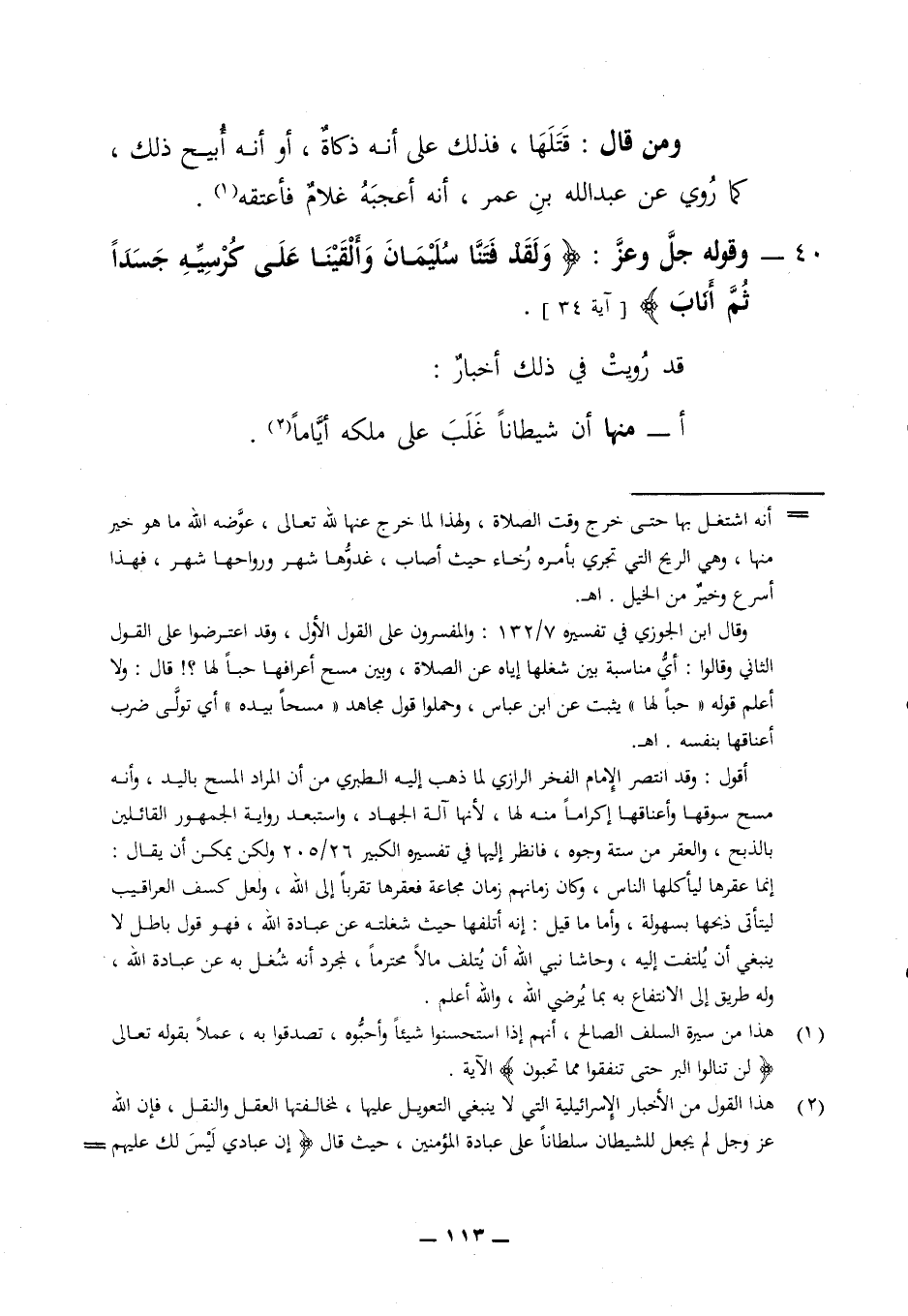 ومن قال قتلها فذلك على أنه ذكاة أو أنه أبيح ذلك كما روي عن عبد الله بن عمر أنه أعجبه غلام فأعتقه 40 - وقوله جل وعز (ولقد فتنا سليمان وألقينا على كرسيه جسدا ثم اناب) (آية 34) قد رويت في ذلك أخبار: أ - منها أن شيطانا غلب على ملكه أياما