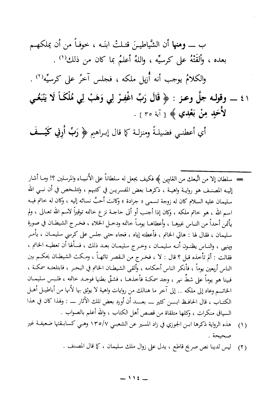 ب - ومنها أن الشياطين قتلت ابنه خوفا من أن يملكهم بعده والقته على كرسيه والله اعلم بما كان من ذلك والكلام يوجب انه أزيل ملكه فجلس آخر على كرسيه 41 - وقوله جل وعز (قال رب اغفر لي وهب لي ملكا لا ينبغي لأحد من بعدي) (آية 35) أي اعطني فضيلة ومنزلة كما قال إبراهيم (رب أرني كيف