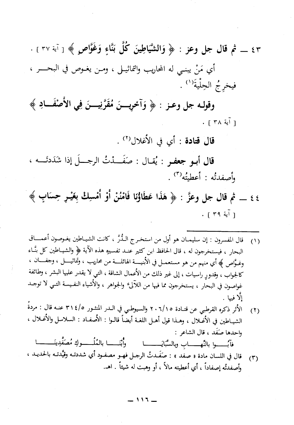 43 - ثم قال جل وعز (والشياطين كل بناء وغواص) (آية 37) أي من يبني له المحاريب والتماثيل ومن يغوص في البحر فيخرج الحلية