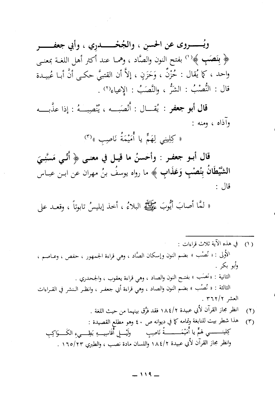 ويروى عن الحسن والجحدري وأبي جعفر (بنصب) بفتح النون والصاد وهما عند أكثر أهل اللغة بمعنى واحد كما يقال حزن وحزن إلا أن القتبي حكى أن أبا عبيدة قال النصب الشر والنصب الإعياء قال أبو جعفر يقال أنصبه ينصبه إذا عذبه وآذاه ومنه: كليني لهم يا أميمة ناصب قال أبو جعفر وأحسن ما قيل في معنى (أني مسني الشيطان بنصب وعذاب) ما رواه يوسف بن مهر ان عن ابن عباس قال لما أصاب أيوب صلى الله عليه وسلم البلاء أخذ إبليس تابوتا وقعد على