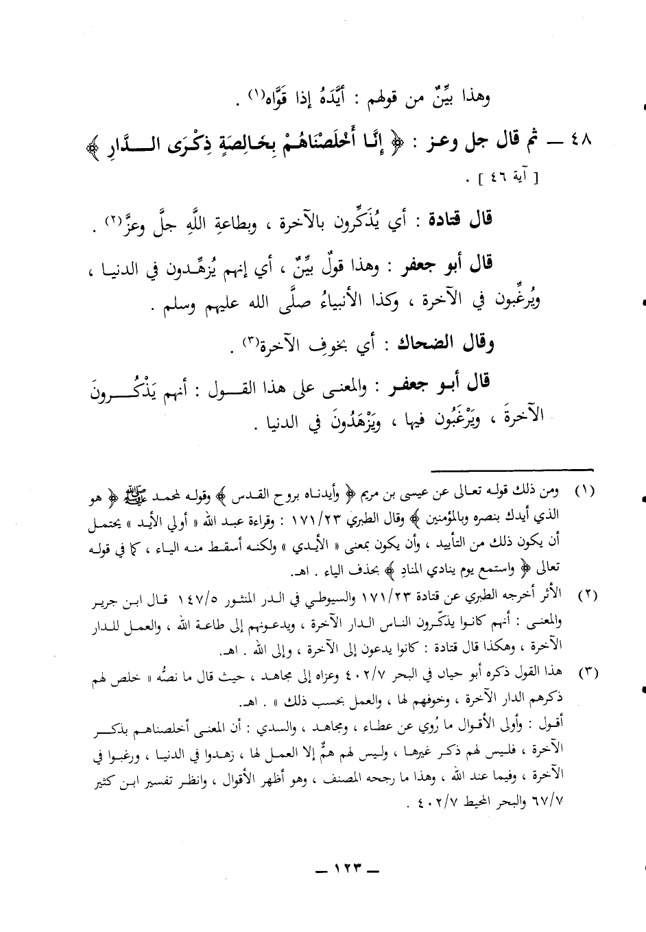 وهذا بين من قولهم أيده إذا قواه 48 - ثم قال جل وعز (إنا أخلصناهم بخالصة ذكرى الدار) (آية 46) قال قتادة أي يذكرون بالآخرة وبطاعة الله جل وعز قال أبو جعفر وهذا قول بين أي إنهم يزهدون في الدنيا ويرغبون في الآخرة وكذا الأنبياء صلى الله عليهم وسلم وقال الضحاك أي بخوف الآخرة قال أبو جعفر والمعنى على هذا القول أنهم يذكرون الآخرة ويرغبون فيها ويزهدون في الدنيا