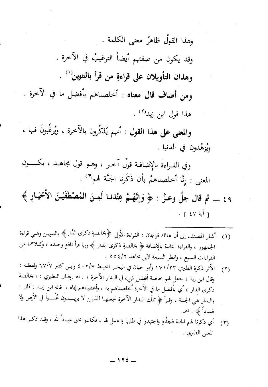 ويزهدون في الدنيا وفي القراءة بالإضافة قول آخر وهو قول مجاهد يكون المعنى إنا أخلصناهم بأن ذكرنا الجنة لهم 49 - ثم قال جل وعز (وإنهم عندنا لمن المصطفين الأخيار) (آية 47)