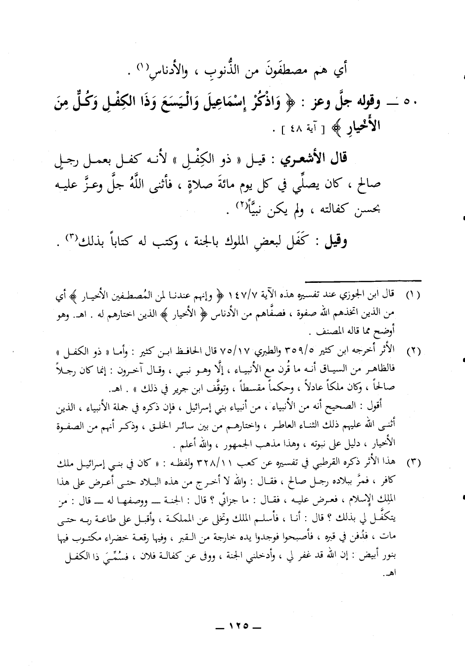 أي هم مصطفون من الذنوب والأدناس 50 - وقوله جل وعز (واذكر إسماعيل واليسع وذا الكفيل وكل من الأخيار) (آية 48) قال الأشعري قيل ذو الكفل لأنه كفل بعمل رجل صالح كان يصلي في كل يوم مائة صلاة فاثنى الله جل وعز عليه بحسن كفالته ولم يكن نبيا وقيل كفل لبعض الملوك بالجنة وكتب له كتابا بذلك