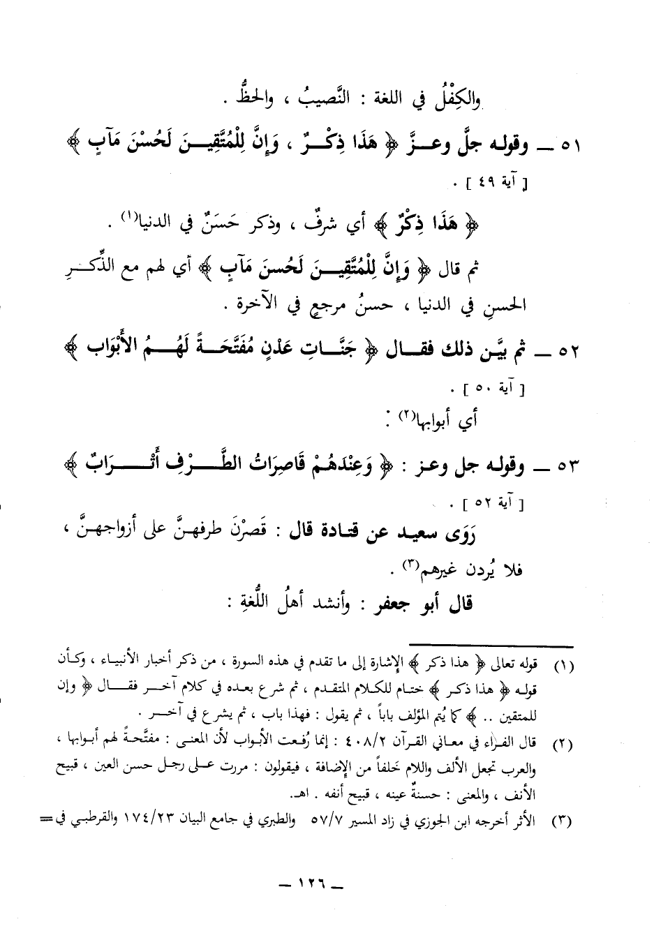 والكفل في اللغة النصيب والحظ 51 - وقوله جل وعز (هذا ذكر وإن للمتقين لحسن مآب) (آية 49) (هذا ذكر) أي شرف وذكر حسن في الدنيا ثم قال (وإن للمتقين لحسن مآب) أي لهم مع الذكر الحسن في الدنيا حسن مرجع في الآخرة 52 - ثم بين ذلك فقال (جنات عدن مفتحة لهم الأبواب) (آية 50)