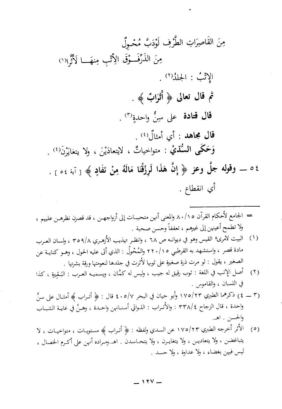 من القاصرات الطرف لودب محول * من الذرفوق ولم الأتب منها لأثرا الإتب الجلد ثم قال تعالى (أتراب) قال قتادة على سن واحدة قال مجاهد أي أمثال وحكى السدي متواخيات لا يتعادين ولا يتغايرن 54 - وقوله جل وعز (إن هذا لرزقنا ماله من نفاد) (آية 54) أي انقطاع