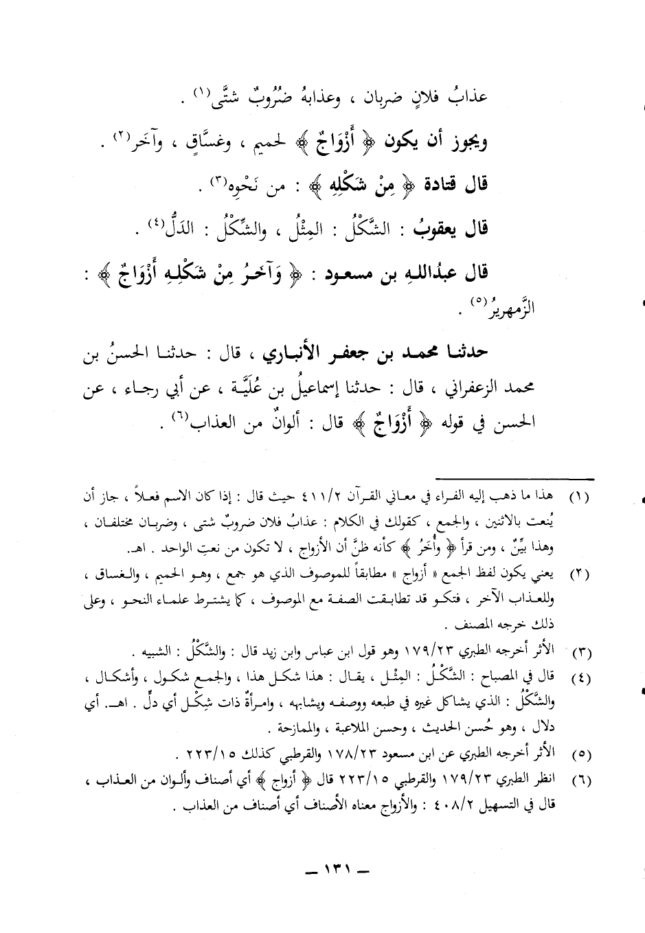 عذاب فلان ضربان وعذابه ضروب شتى ويجوز أن يكون أزواج لحميم وغساق وآخر قال قتادة من شكله من نحوه قال يعقوب الشكل المثل والشكل الدل قال عبد الله بن مسعود وآخر من شكله أزواج الزمهرير حدثنا محمد بن جعفر الأنباري قال حدثنا الحسن بن محمد الزعفراني قال حدثنا إسماعيل بن علية عن أبي رجاء عن الحسن في قوله أزواج قال ألوان من العذاب