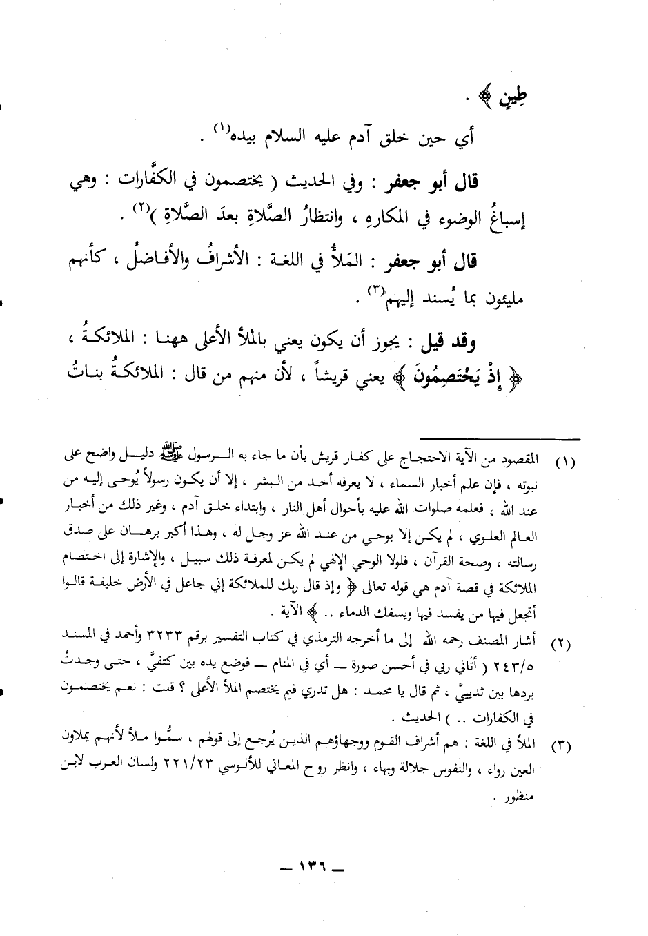 طين) أي حين خلق آدم عليه السلام بيده قال أبو جعفر وفي الحديث يختصمون في الكفارات وهي إسباغ الوضوء في المكاره وانتظار الصلاة بعد الصلاة قال أبو جعفر الملأ في اللغة الأشراف الأفاضل كأنهم مليئون بما يسند إليهم وقد قيل يجوز أن يكون يعني بالملأ الأعلى ههنا الملائكة (إذ يختصمون) يعني قريشا لأن منهم من قال الملائكة بنات