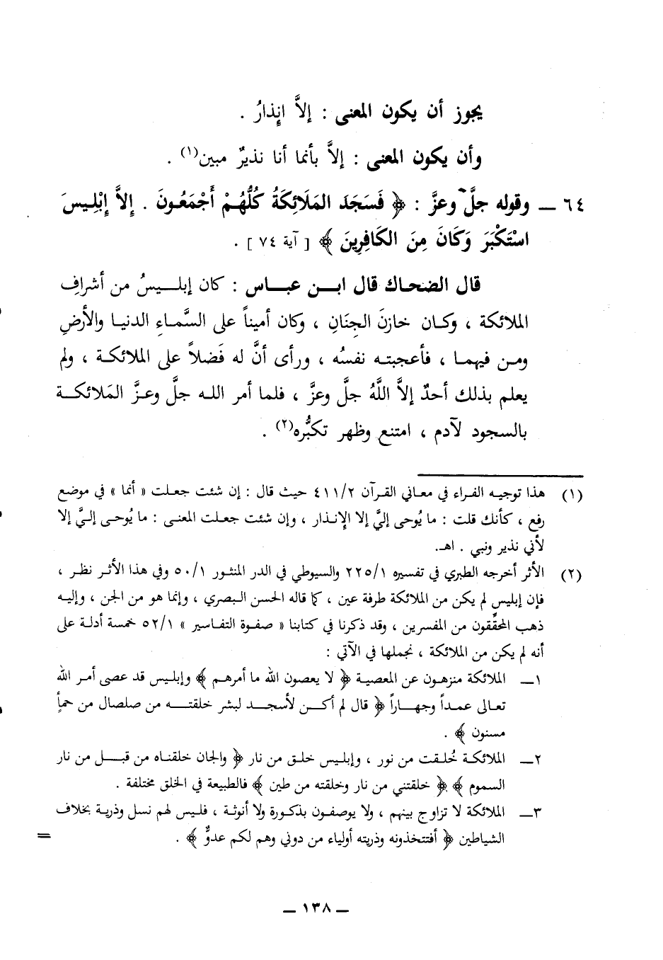 يجوز أن يكون المعنى: إلا إنذار وأن يكون المعنى إلا بأنما أنا نذير مبين 64 - وقوله جل وعز (فسجد الملائكة كلهم أجمعون إلا إبليس استكبر وكان من الكافرين) (آية 74) قال الضحاك قال ابن عباس كان إبليس من أشراف الملائكة وكان خازن الجنان وكان أمينا على السماء الدنيا والأرض ومن فيهما فأعجبته نفسه ورأى أن له فضلا على الملائكة ولم يعلم بذلك أحد إلا الله جل وعز فلما أمر الله جل وعز الملائكة بالسجود لآدم امتنع وظهر تكبره