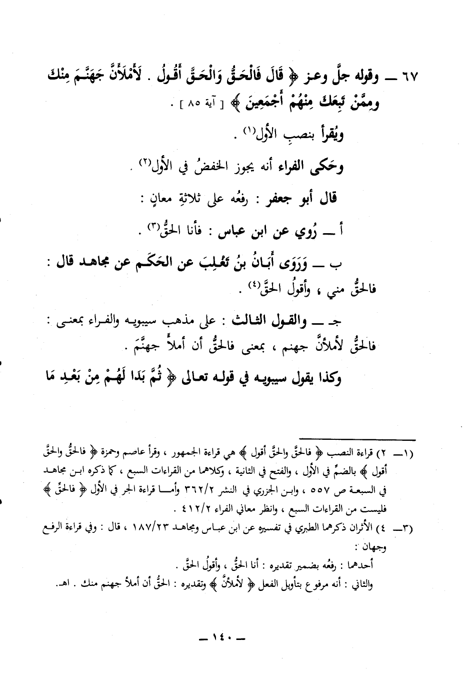 67 - وقوله جل وعز (قال فالحق والحق أقول لأملأن جهنم منك وممن تبعك منهم أجمعين) (آية 85) ويقرأ بنصب الأول وحكى الفراء أنه يجوز الخفض في الأول قال أبو جعفر رفعه على ثلاثة معان أ - روي عن ابن عباس فأنا الحق ب - وروى أبان بن تعلب عن الحكم عن مجاهد قال فالحق مني وأقول الحق ج - والقول الثالث على مذهب سيبويه والفراء بمعنى فالحق لأملأن جهنم بمعنى فالحق أن أملأ جهنم وكذا يقول سيبويه في وقوله تعالى (ثم بدا لهم من بعد ما