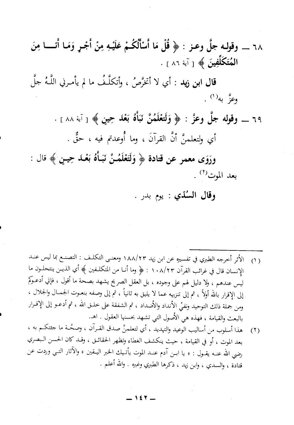 68 - وقوله جل وعز (قل ما أسالكم عليه من أجر وما أنا من المتكلفين) (آية 86) قال ابن زيد أي لا أتخرص وأتكلف ما لم يأمرني الله جل وعز به 69 - وقوله جل وعز (ولتعلمن نباه بعد حين) (آية 88) أي ولتعلمن أن القرآن وما أو عدتم فيه حق وروى معمر عن قتادة (ولتعلمن نبأه بعد حين) قال بعد الموت