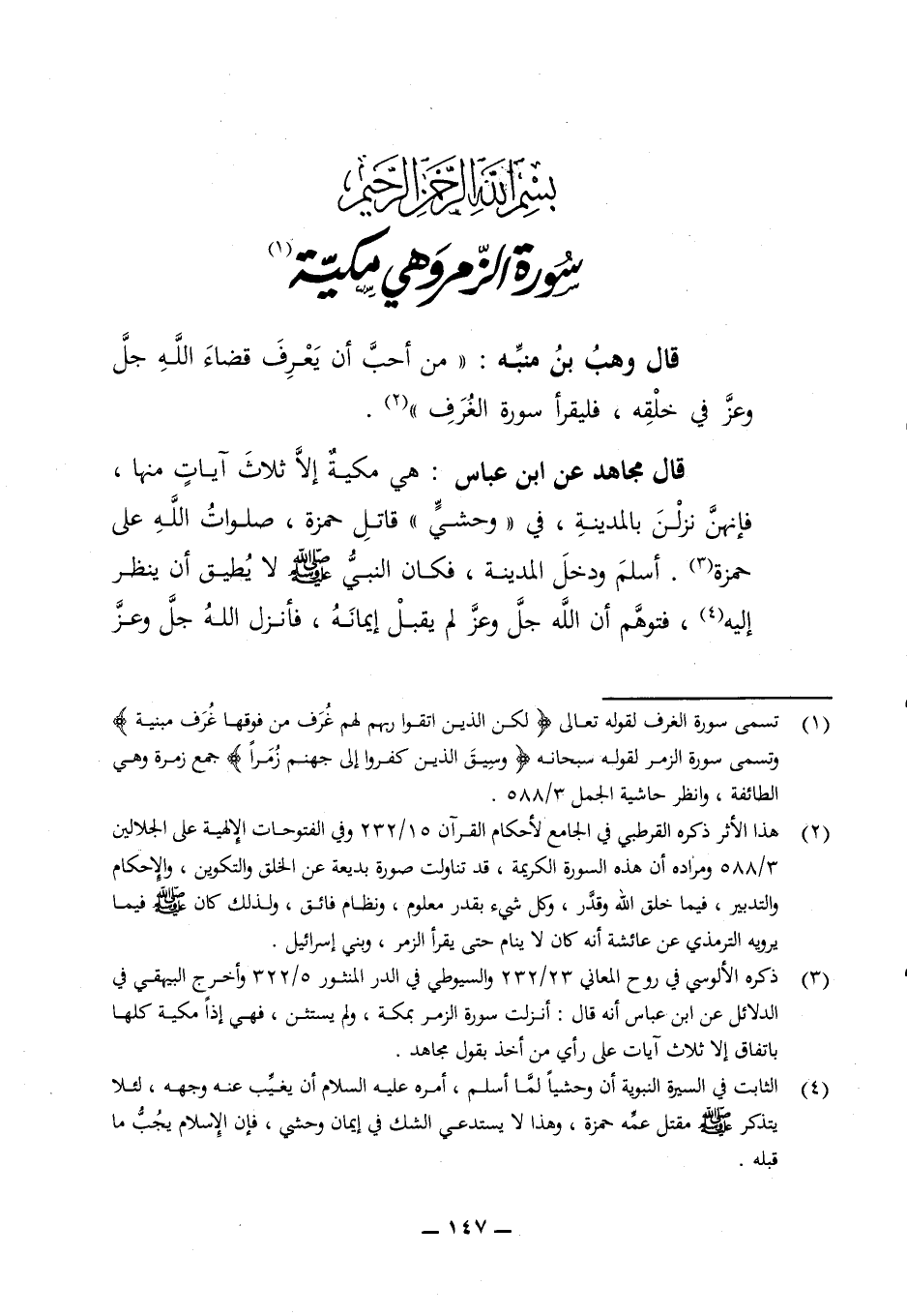 بسم الله الرحمن الرحيم سورة الزمر وهي مكية قال وهب بن منبه من أحب أن يعرف قضاء الله جل وعز في خلقه فليقرأ سورة الغرف قال مجاهد عن ابن عباس هي مكية إلا ثلاث آيات منها فإنهن نزلن بالمدينة في وحشي قاتل حمزة صلوات الله على حمزة اسلم ودخل المدينة فكان النبي صلى الله عليه وسلم لا يطيق أن ينظر إليه فتوهم أن الله جل وعز لم يقبل إيمانه فأنزل الله جل وعز