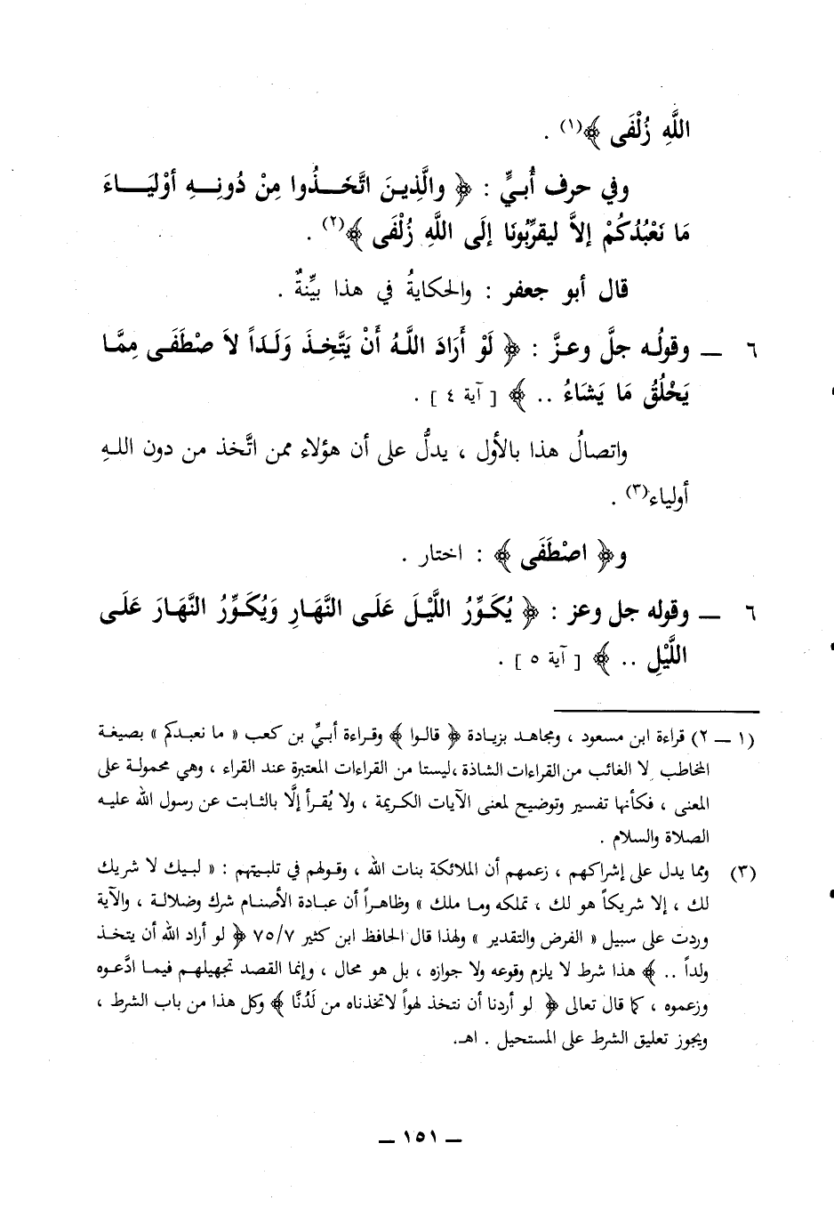 الله زلفى) وفي حرف أبي (والذين اتخذوا من دونه أولياء ما نعبدكم إلا ليقربونا إلى الله زلفى) قال أبو جعفر والحكاية في هذا بينة 6 - وقوله جل وعز (لو أراد الله أن يتخذ ولدا لاصطفى مما يخلق ما يشاء) (آية 4) واتصال هذا بالأول يدل على أن هؤلاء ممن اتخذ من دون الله أولياء و (اصطفى) اختار 6 - وقوله جل وعز (يكور الليل على النهار ويكور النهار على الليل) (آية 5)