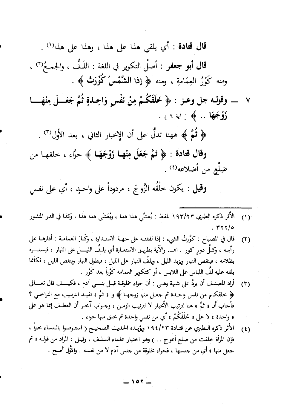 ومنه كور العمامة ومنه (إذا الشمس كورت) 7 - وقوله جل وعز (خلقكم من نفس واحدة ثم جعل منها زوجها) (آية 6) (ثم) ههنا تدل على أن الإخبار الثاني بعد الأول وقال قتادة (ثم جعل منها زوجها) حواء خلقها من ضلع من أضلاعه وقيل يكون خلقه الزوج مردودا على واحد أي على نفس