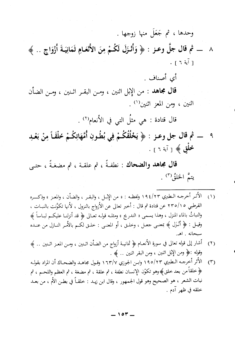 وحدها ثم جعل منها زوجها 8 - ثم قال جل وعز (وأنزل لكم من الأنعام ثمانية أزواج) (آية 6) أي أصناف قال مجاهد من الإبل اثنين ومن البقر اثنين ومن الضان اثنين ومن المعز اثنين قال قتادة هي مثل التي في الأنعام 9 - ثم قال جل وعز (يخلقكم في بطون أمهاتكم خلقا من بعد خلق) (آية 6) قال مجاهد والضحاك نطفة ثم علقة ثم مضغة حتى يتم الخلق