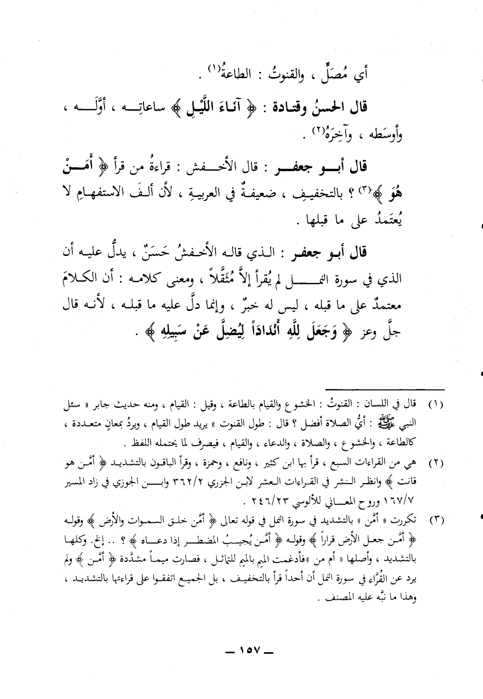 أي مصل والقنوت الطاعة قال الحسن وقتادة (آناء الليل) ساعاته أوله واوسطه وآخره قال أبو جعفر قال الأخفش قراءة من قرأ (أمن هو) ؟ بالتخفيف ضعيفة في العربية لأن الف الاستفهام لا يعتمد على ما قبلها قال أبو جعفر الذي قاله الأخفش حسن يدل عليه ان الذي في سورة النمل لم يقرأ إلا مثقلا ومعنى كلامه أن الكلام معتمد على ما قبله ليس له خبر وإنما دل عليه ما قبله لأنه قال جل وعز (وجعل لله أندادا ليضل عن سبيله)