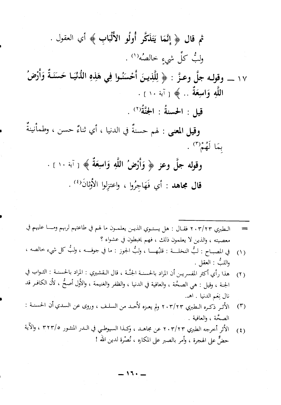 ثم قال (إنما يتذكر أولو الألباب) أي العقول ولب كل شئ خالصه 17 - وقوله جل وعز (للذين أحسنوا في هذه الدنيا حسنة وأرض