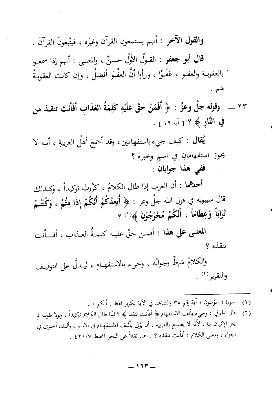 والقول الآخر: أنهم يستمعون القرآن وغيره فيتبعون القرآن قال أبو جعفر القول الأول حسن والمعنى أنهم إذا سمعوا بالعقوبة والعفو عفوا ورأوا أن العفو افضل وغن كانت العقوبة لهم 23 - وقوله جل وعز (أفمن حق عليه كلمة العذاب أفأنت تنقذ من في النار) (آية 19) يقال كيف جئ باستفهامين وقد أجمع أهل العربية انه لا يجوز استفهامان في اسم وخبره؟ ففي هذا جوابان: أحدهما ان العرب إذا طال الكلام كررت توكيدا وكذلك قال سيبويه في قول الله جل وعز (أيعدكم أنكم إذا متم وكنتم ترابا وعظاما أنكم مخرجون) ؟ المعنى على هذا افمن حق عليه كلمة العذاب أفأنت