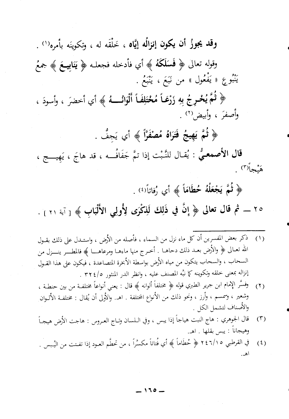 (ثم يهيج فتراه مصفرا) أي يجف قال الأصمعي يقال للنبت إذا تم جفافه قد هاج يهيج هيجا (ثم يجعله حطاما) أي رفاتا 25 - ثم قال تعالى (إن في ذلك لذكرى لأولي الألباب) (آية 21)