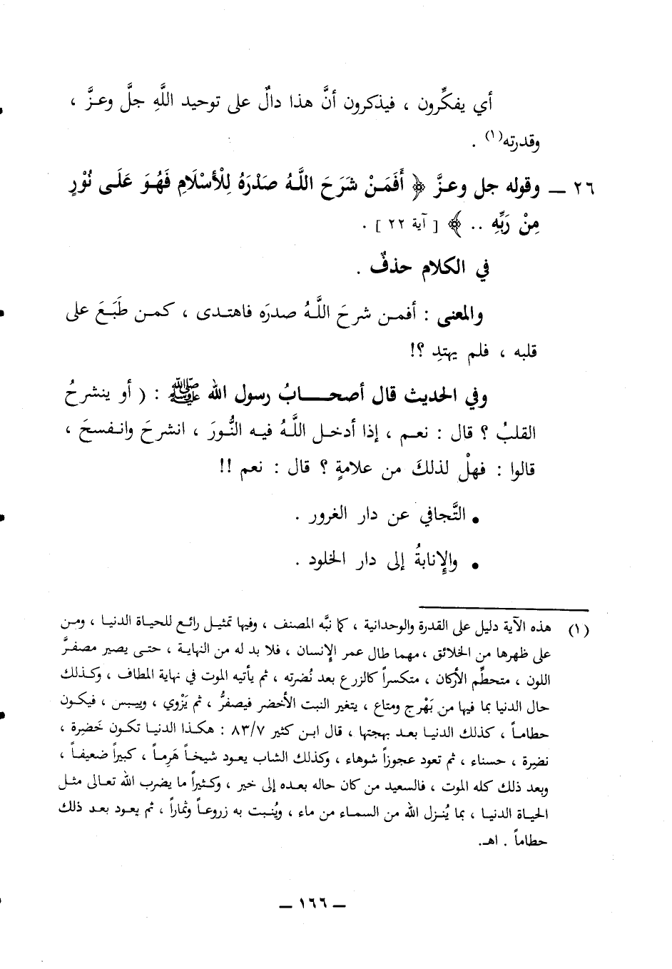 أي يفكرون فيذكرون ان هذا دال على توحيد الله جل وعز وقدرته 26 - وقوله جل وعز (أفمن شرح الله صدره للإسلام فهو على نور من ربه) (آية 22) في الكلام حذف والمعنى افمن شرح الله صدره فاهتدى كمن طبع على قلبه فلم يهتد؟ وفي الحديث قال أصحاب رسول الله صلى الله عليه وسلم أو ينشرح القلب؟ قال نعم إذا أدخل الله فيه النور انشرح وانفسح قالوا فهل لذلك من علامة قال نعم! ! التجافي عن دار الغرور والإنابة إلى دار الخلود