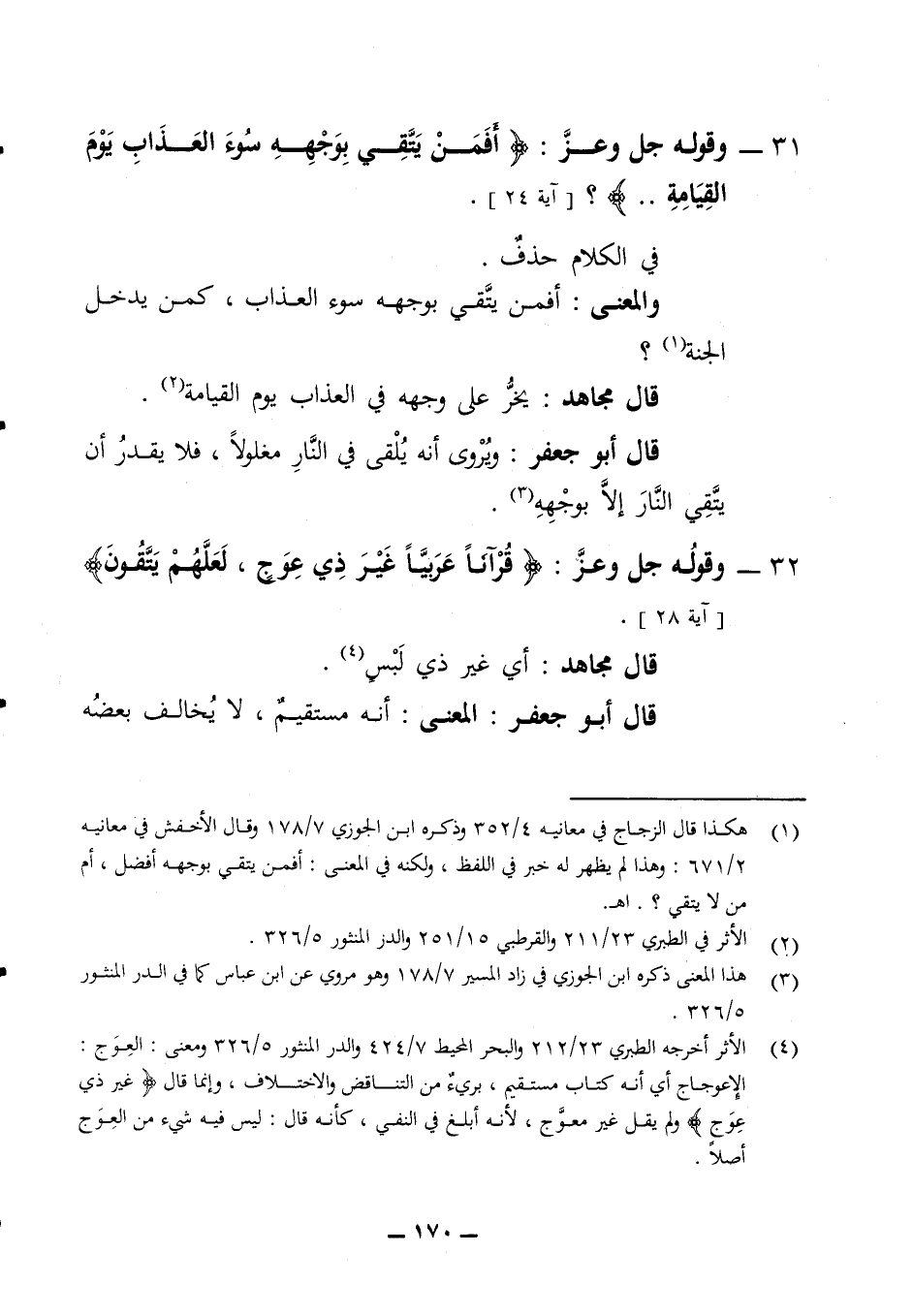 31 - وقوله جل وعز (أفمن يتقي بوجهه سوء العذاب يوم القيامة) (آية 24) في الكلام حذف والمعنى أفمن يتقي بوجهه سوء العذاب كمن يدخل الجنة؟ قال مجاهد يخر على وجهه في العذاب يوم القيامة قال أبو جعفر ويروى أنه يلقى في النار مغلولا فلا يقدر ان يتقي النار إلا بوجهه 32 - وقوله جل وعز (قرآنا عربيا غير ذي عوج لعلهم يتقون) (آية 28) قال مجاهد أي غير ذي لبس قال أبو جعفر المعنى أنه مستقيم لا يخالف بعضه
