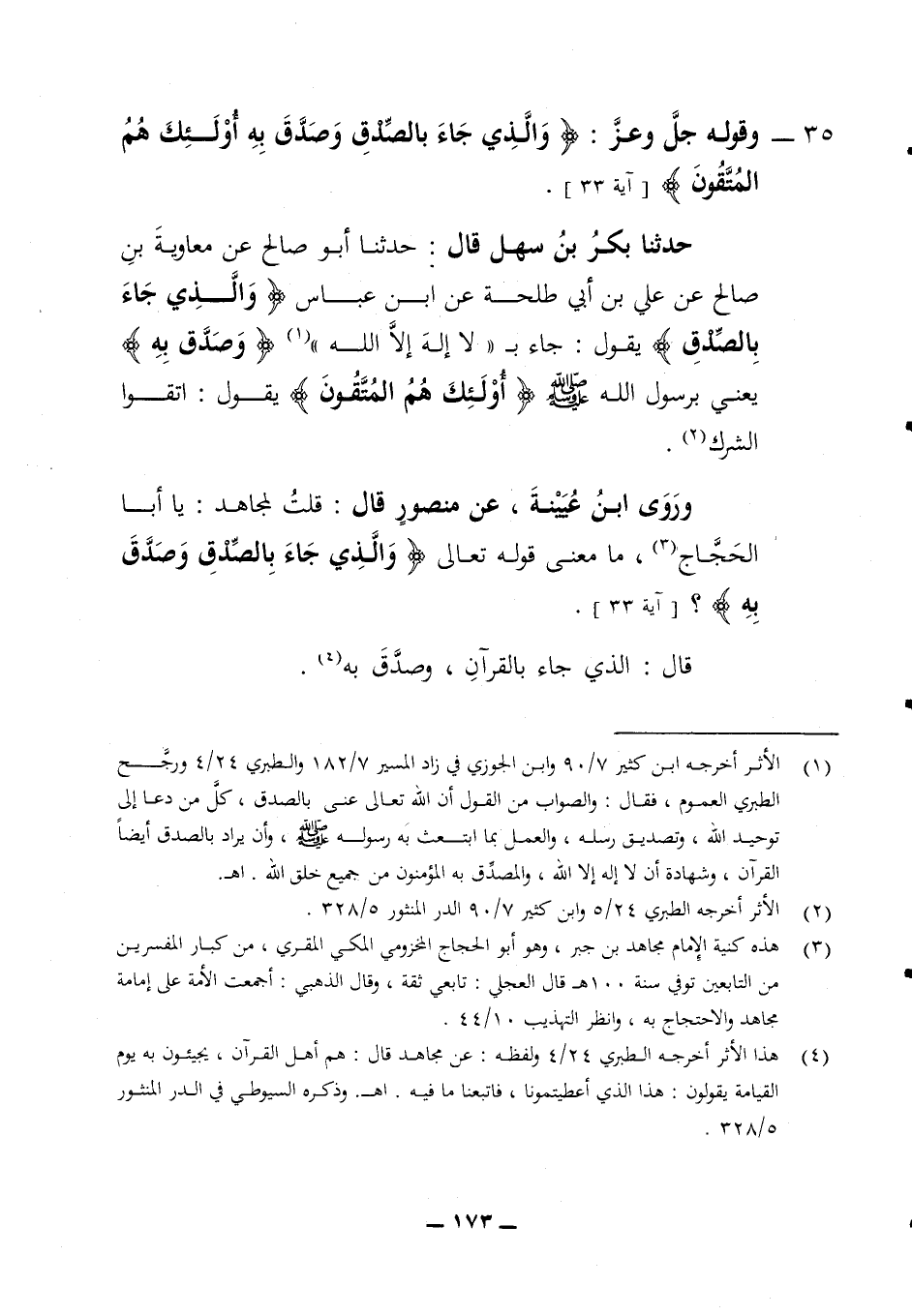 بالصدق) يقول جاء ب لا إله إلا الله (وصدق به) يعني برسول الله صلى الله عليه وسلم أولئك هم المتقون يقول اتقوا الشرك وروى ابن عيينة عن منصور قال قلت لمجاهد يا أبا الحجاج ما معنى قوله تعالى (والذي جاء بالصدق وصدق به) (آية 33) قال الذي جاء بالقرآن وصدق به
