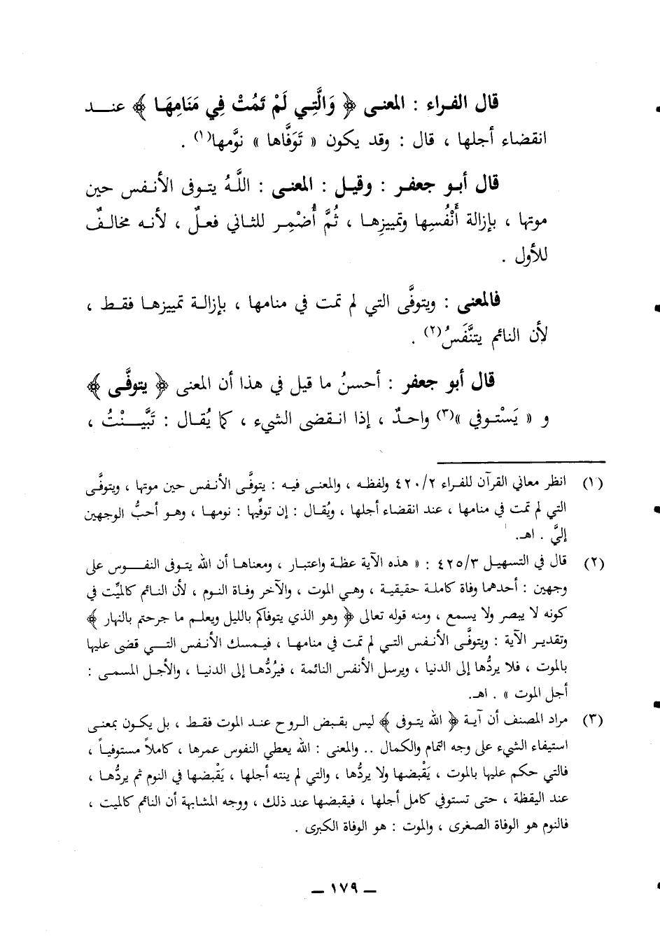موتها بإزالة أنفسها وتمييزها ثم أضمر للثاني فعل لأنه مخالف للأول فالمعنى ويتوفى التي لم تمت في منامها بإزالة تمييزها فقط لأن النائم يتنفس قال أبو جعفر أحسن ما قيل في هذا أن المعنى (يتوفى) و (يستوفي) واحد إذا انقضى الشئ كما يقال تبينت