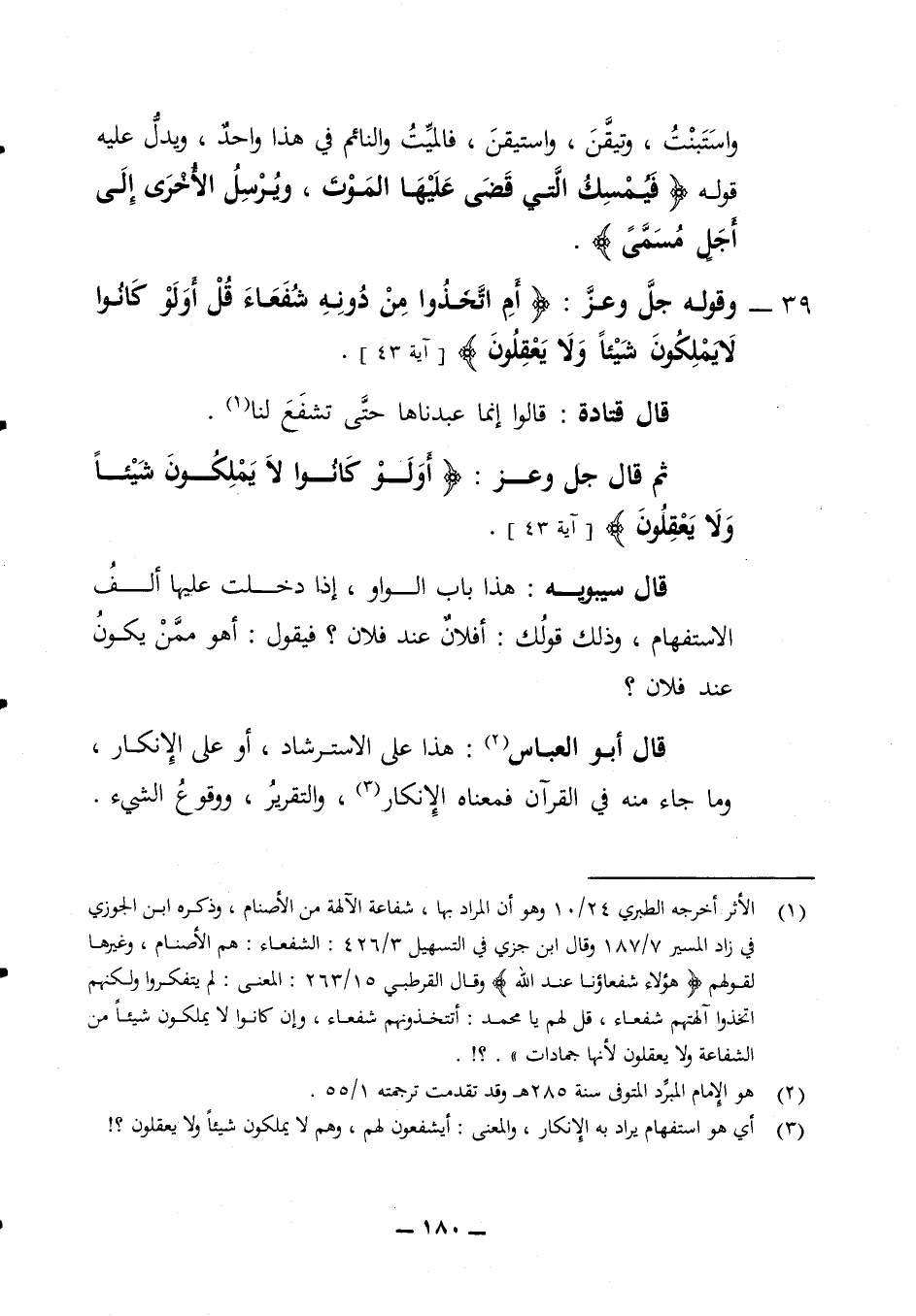 واستبنت سعيد وتيقن واستيقن فالميت والنائم في هذا واحد ويدل عليه قوله (فيمسك التي قضى عليها الموت ويرسل الأخرى إلى أجل مسمى) 39 - وقوله جل وعز (أم اتخذوا من دونه شفعاء قل أولو كانوا لا يملكون شئا ولا يعقلون) (آية 43) قال قتادة قالوا إنما عبدناها بكر حتى تشفع لنا ثم قال جل وعز (أولو كانوا لا يملكون شيئا ولا يعقلون) (آية 43) قال سيبويه هذا باب الواو إذا دخلت عليها ألف الاستفهام وذلك قولك افلان قد عند فلان فيقول أهو ممن يكون عند فلان؟ قال أبو العباس هذا على الاسترشاد أو على الإنكار وما جاء منه في القرآن فمعناه الإنكار والتقرير ووقوع الشئ