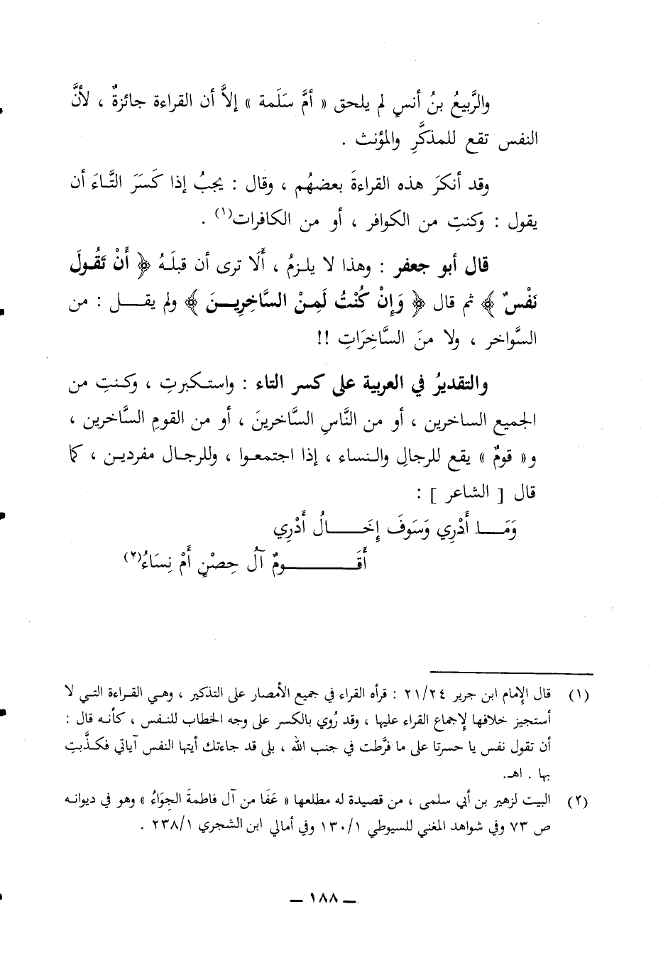 والربيع بن أنس لم يلحق أم سلمة إلا أن القراءة جائزة لأن النفس تقع للمذكر والمؤنث وقد أنكر هذه القراءة بعضهم وقال يجب إذا كسر التاء أن يقول وكنت من الكوافر أو من الكافرات قال أبو جعفر وهذا لا يلزم ألا ترى ان قبله أن تقول نفس ثم قال وإن كنت لمن الساخرين ولم يقل من السواخر ولا من الساخرات والتقدير في العربية على كسر التاء واستكبرت وكنت من