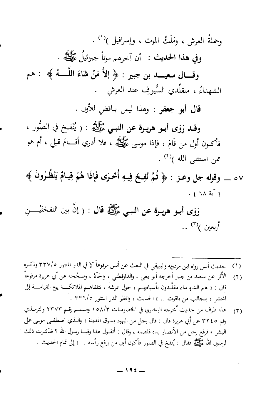 وحملة العرش وملك الموت وإسرافيل وفي هذا الحديث أن آخرهم موتا جبرائيل صلى الله عليه وسلم وقال سعيد بن جبير إلا من شاء الله هم الشهداء متقلدي السيوف عند العرش قال أبو جعفر وهذا ليس بناقض للأول وقد روى أبو هريرة عن النبي صلى الله عليه وسلم (ينفخ في الصور فأكون أول من قام فإذا موسى صلى الله عليه وسلم فلا أدري اقام قبلي أم هو ممن استثى الله)