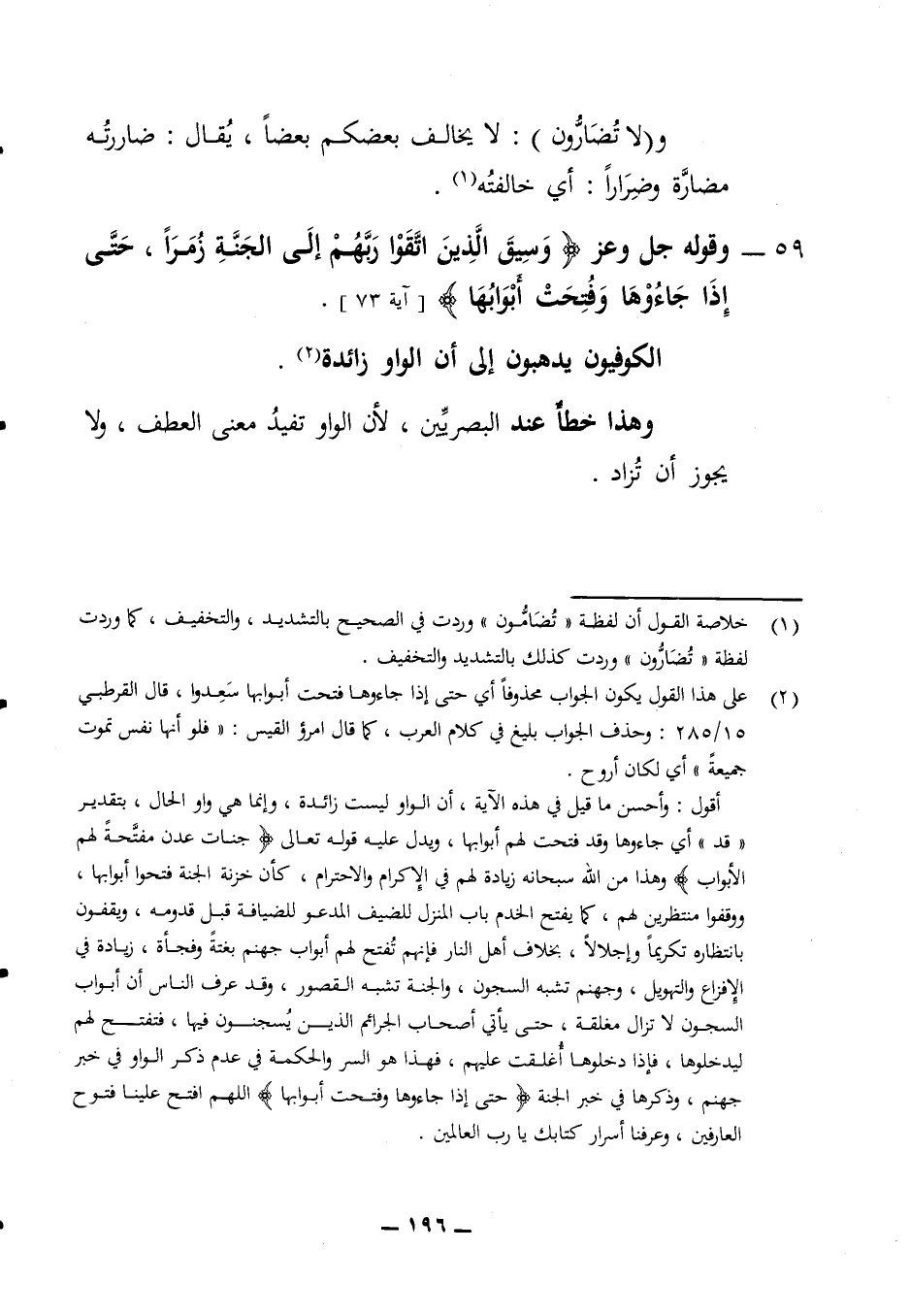 ولا تضارون لا يخالف بعضكم بعضا يقال ضاررته مضارة وضرارا أي خالفته 59 - وقوله جل وعز (وسيق الذين اتقوا ربهم إلى الجنة زمرا حتى إذا جاءوها وفتحت ابوابها) (آية 73)
