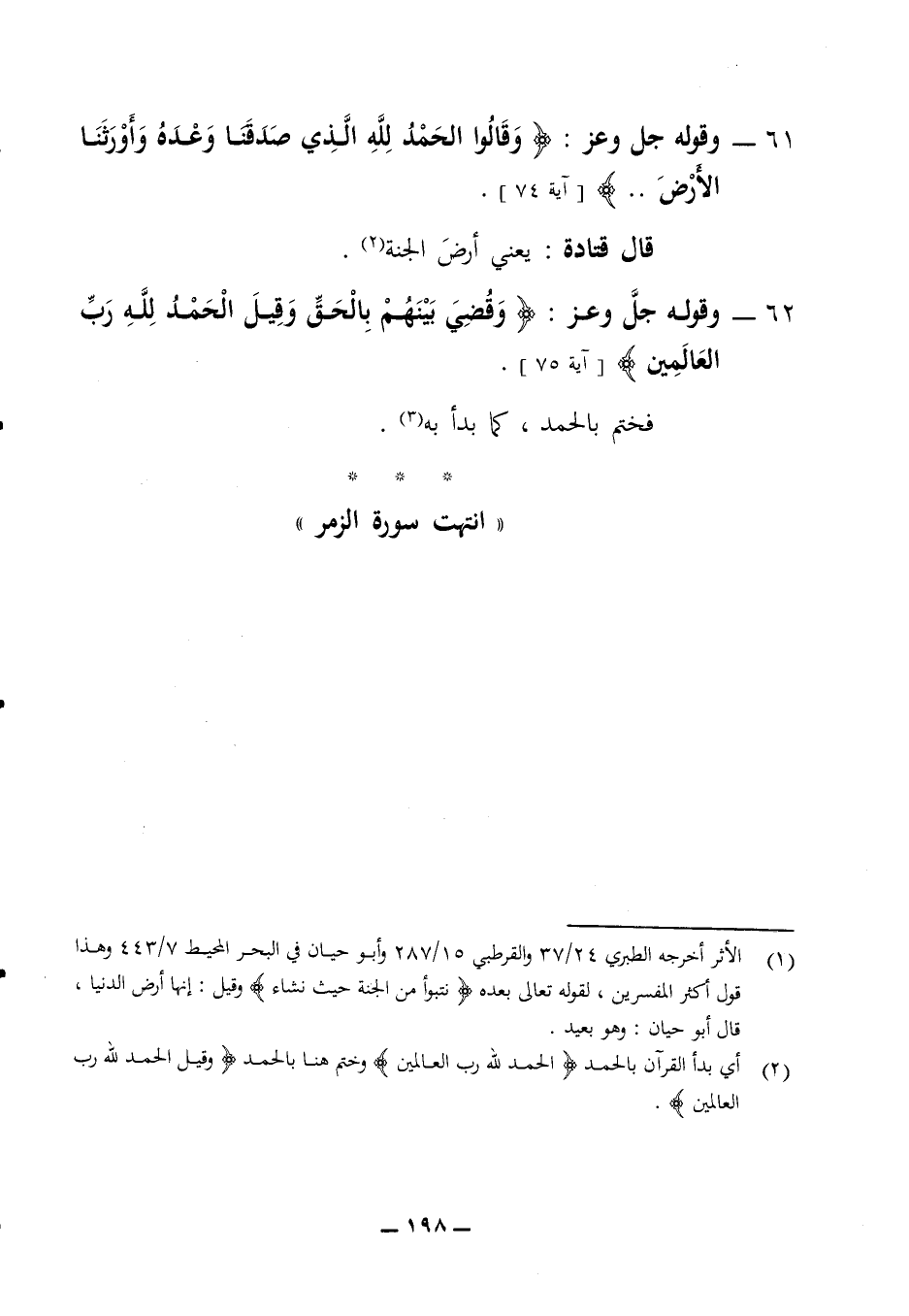 61 - وقوله جل وعز (وقالوا الحمد لله الذي صدقنا وعده وأورثنا الأرض) (آية 74) قال قتادة يعني أرض الجنة 62 - وقوله جل وعز (وقضي بينهم بالحق وقيل الحمد لله رب العالمين) (آية 75) فختم بالحمد كما بدأ به انتهت سورة الزمر