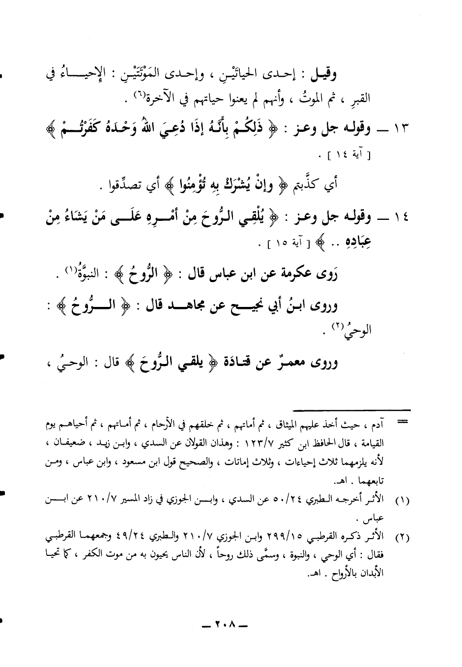 وقيل إحدى الحياتين وإحدى الموتتين الإحياء في القبر ثم الموت وأنهم لم يعنوا حياتهم في الآخرة 13 - وقوله جل وعز (ذلكم بأنه إذا دعي الله وحده كفرتم) (آية 14) أي كذبتم (وإن يشرك به تؤمنوا) أي تصدقوا 14 - وقوله جل وعز (يلقي الروح من أمره على من يشاء من عباده) (آية 15) روى عكرمة عن ابن عباس قال (الروح) النبوة وروى ابن ابي نجيح عن مجاهد قال (الروح) الوحي وروى معمر عن قتادة يلقي الروح قال الوحي