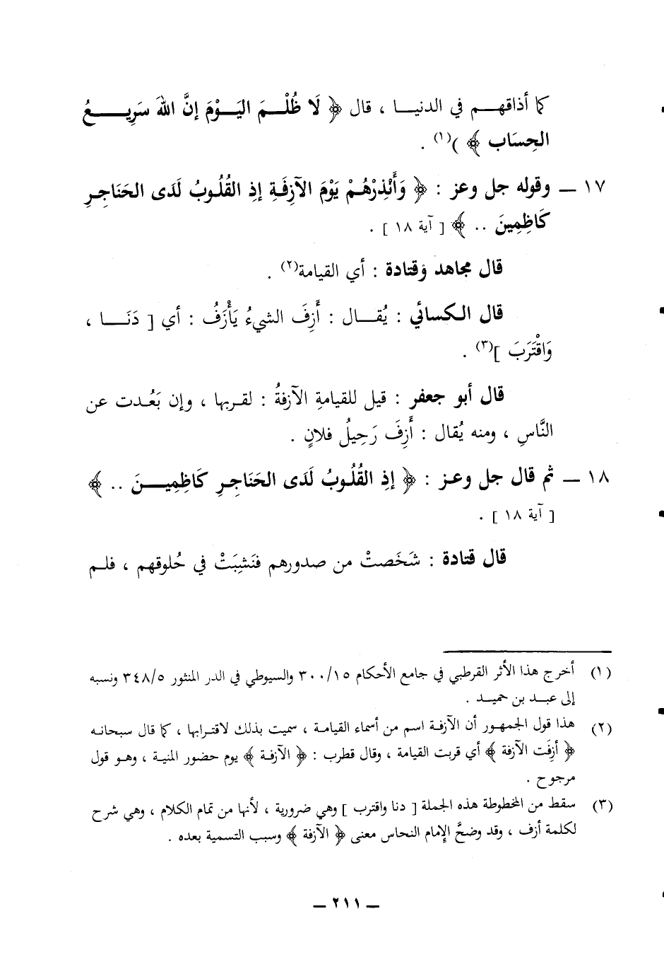 18 - ثم قال جل وعز (إذ القلوب لدى الحناجر كاظمين) (آية 18) قال قتادة شخصت من صدورهم فنشبت في حلوقهم فلم