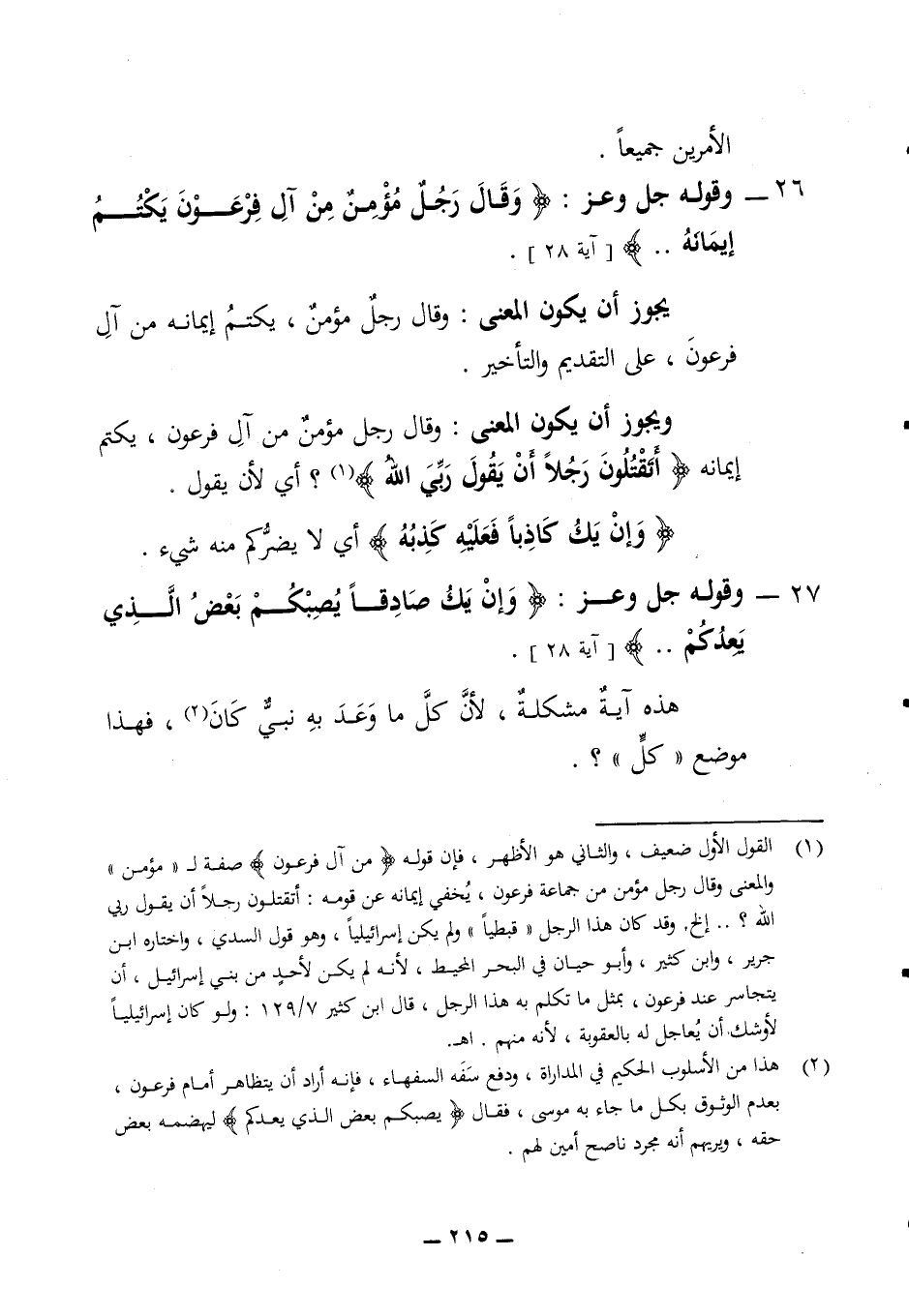 26 - وقوله جل وعز (وقال رجل مؤمن من آل فرعون يكتم إيمانه) (آية 28) يجوز أن يكون المعنى وقال رجل مؤمن يكتم إيمانه من آل فرعون على التقديم والتأخير ويجوز أن يكون المعنى وقال رجل مؤمن من آل فرعون يكتم إيمانه (أتقتلون رجلا أن يقول ربي الله) أي لأن يقول (وإن يك كاذبا فعليه كذبه) أي لا يضركم منه شئ 27 - وقوله جل وعز (وإن يك صادقا يصبكم بعض الذي يعدكم) (آية 28) هذه آية مشكلة لأن كل ما وعد به نبي كان فهذا موضع كل