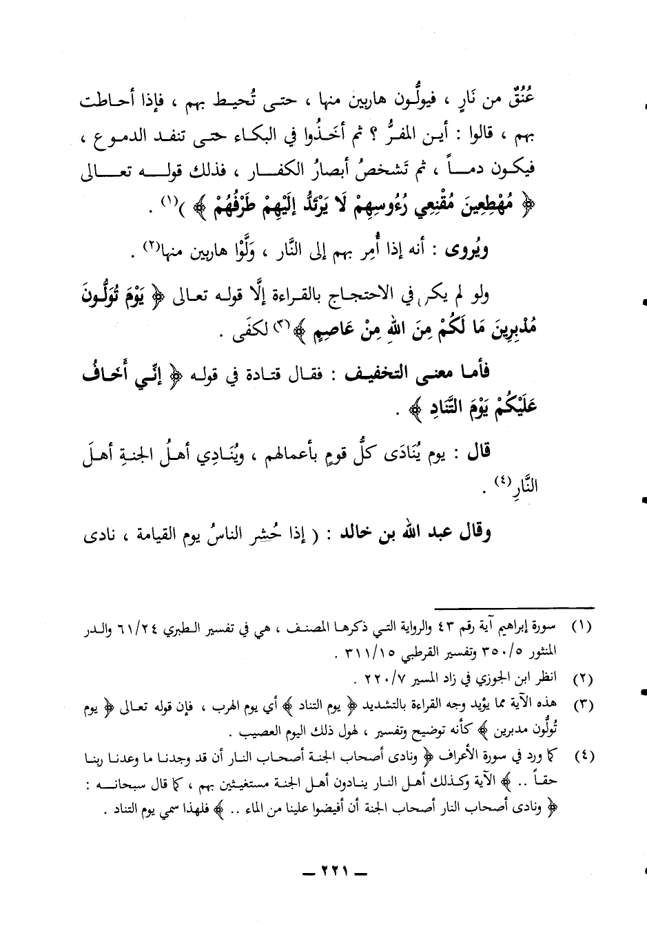 عنق من نار فيولون هاربين منها حتى تحيط بهم فإذا أحاطت بهم قالوا أين المفر ثم أخذوا في البكاء حتى تنفد الدموع فيكون دما ثم تشخص أبصار الكفار فذلك قوله تعالى (مهطعين مقنعي رؤسهم لا يرتد إليهم طرفهم) ويروي أنه إذا أمر بهم إلى النار ولوا هاربين منها ولو لم يكن في الاحتجاج بالقراءة إلا قوله تعالى (يوم تولون مدبرين ما لكم من الله من عاصم) لكفى فأما معنى التخفيف فقال قتادة في قوله (إني أخاف عليكم يوم التناد) قال يوم ينادى كل قوم بأعمالهم وينادي أهل الجنة أهل النار وقال عبد الله بن خالد إذا حشر الناس يوم القيامة نادى
