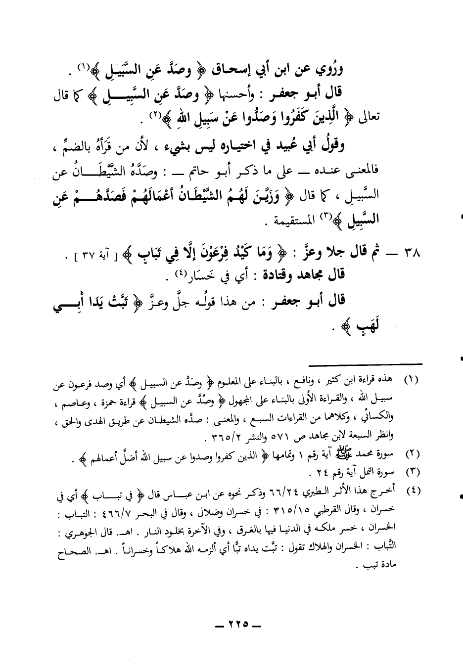 وروي عن ابن أبي إسحاق (وصد عن السبيل) قال أبو جعفر وأحسنها (وصد عن السبيل) كما قال تعالى (الذين كفروا وصدوا عن سبيل الله) وقول أبي عبيد في اختياره ليس بشئ لأن من قرأه بالضم فالمعنى عنده على ما ذكر أبو حاتم وصده الشيطان عن السبيل كما قال (وزين لهم الشيطان أعمالهم فصدهم عن السبيل) المستقيمة 38 - ثم قال جلا وعز (وما كيد فرعون إلا في تباب) (آية 37) قال مجاهد وقتادة أي في خسار قال أبو جعفر من هذا قوله جل وعز (تبت يدا أبي لهب)