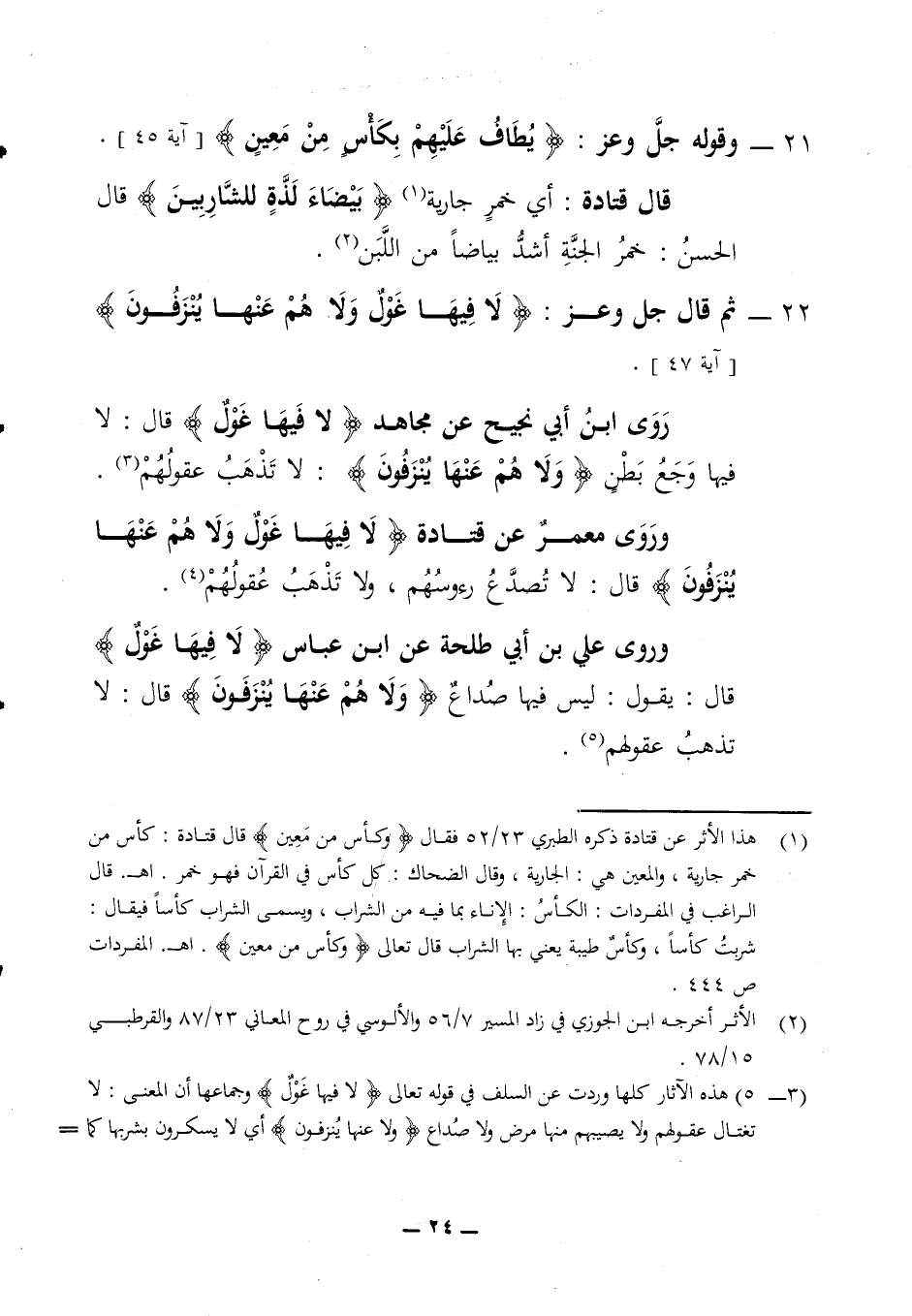 21 - وقوله جل وعز (يطاف عليهم بكأس من معين) (آية 45) قال قتادة أي خمر جارية (بيضاء لذة للشاربين) قال الحسن خمر الجنة أشد بياضا من اللبن ثم قال جل وعز (لا فيها غول ولا هم عنها ينزفون) (آية 47) روى ابن أبي نجيح عن مجاهد (لا فيها غول) قال لا فيها وجع بطن (ولا هم عنها ينزفون) لا تذهب عقولهم وروى معمر عن قتادة (لا فيها غول ولا هم عنها ينزفون) قال لا تصدع رؤسهم ولا تذهب محمد عقولهم